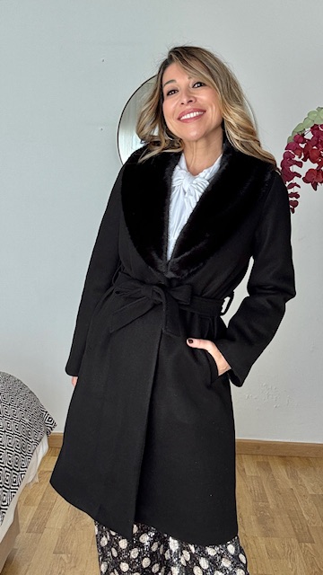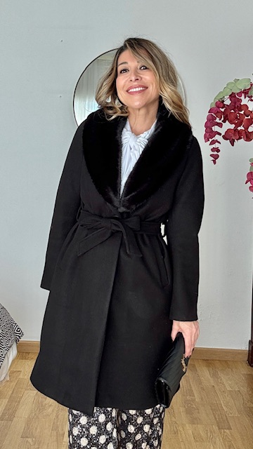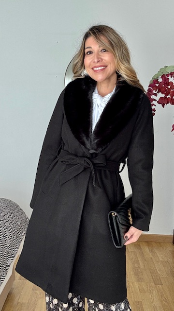 Abrigo 3/4 con cuellos extraíble en color negro con cinturón. Talla única válida desde la 36 hasta la 40.