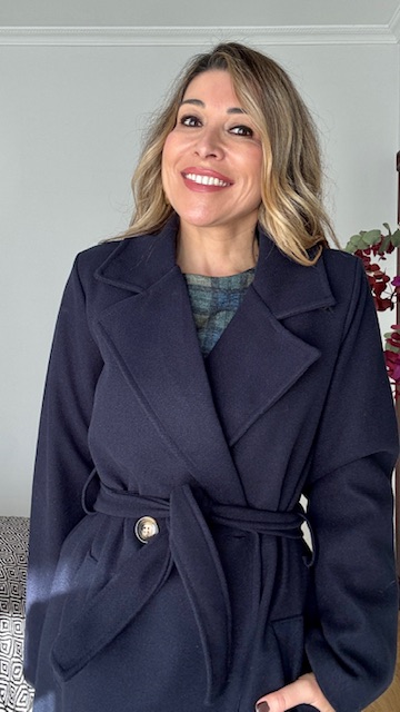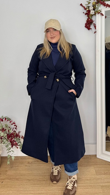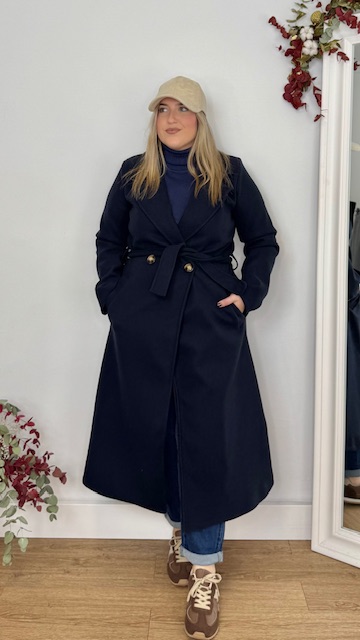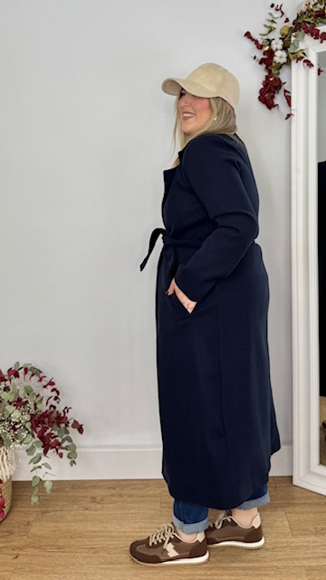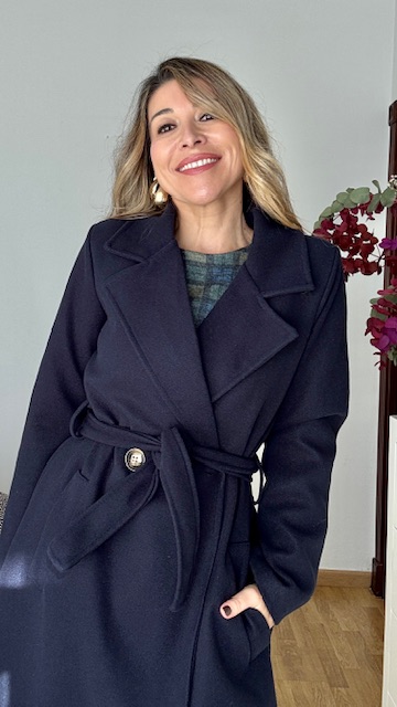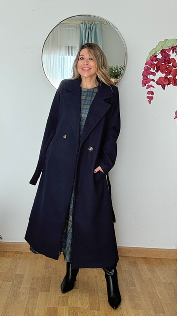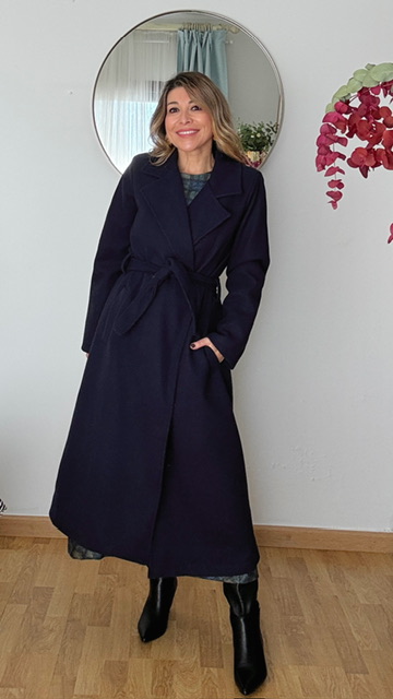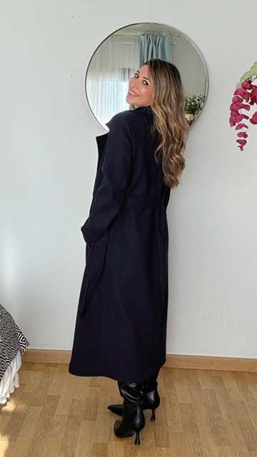 Abrigo de paño con cinturón en color azul marino. Talla única válida desde la 36 hasta la 44.