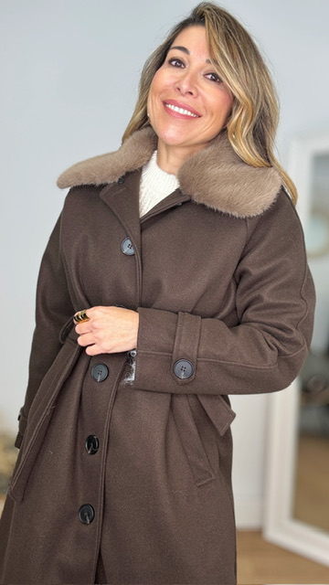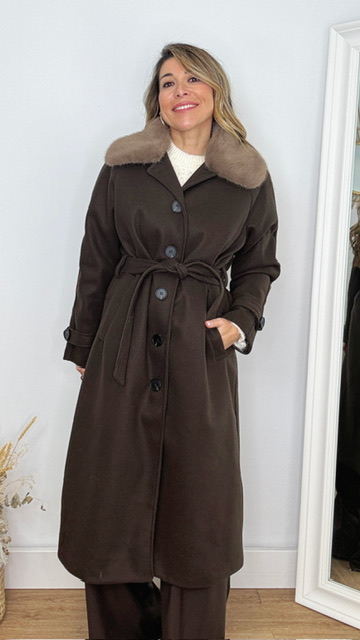 Abrigo de paño con cuello de pelo sintético extraíble en color marrón. Talla única válida desde la 36 hasta la 44.