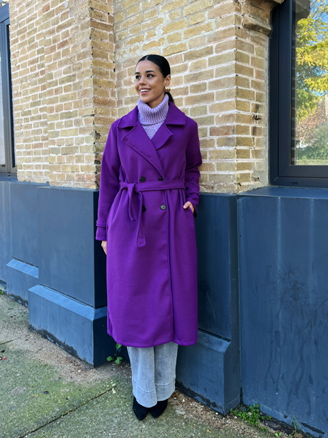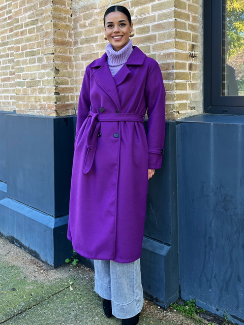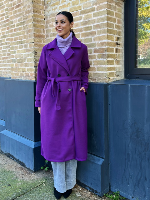 Abrigo de paño con cinturón de paño en color morado. Talla única válida desde la 36 hasta la 44.