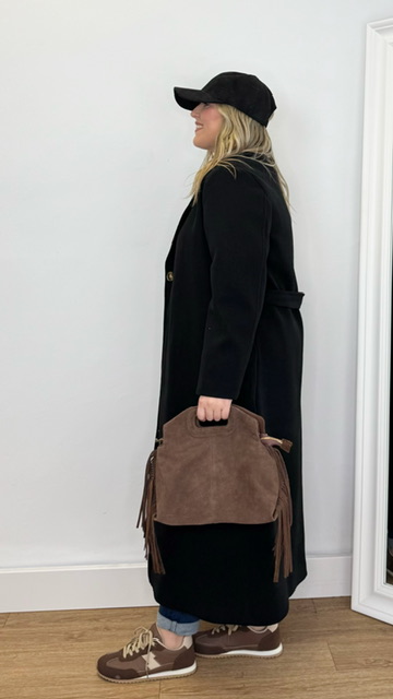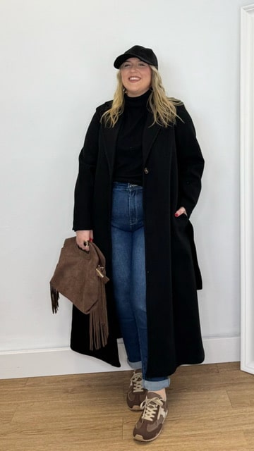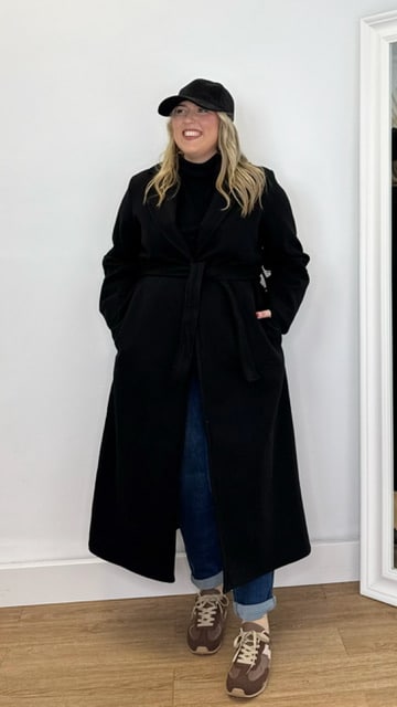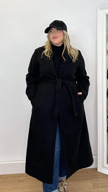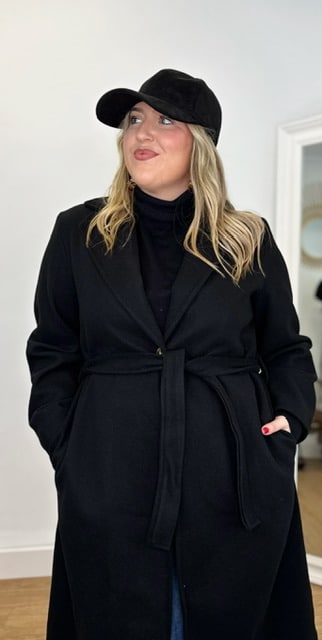 Abrigo de paño con cinturón y bolsillos. Completamente forrado. Talla única válida desde la 36 hasta la 44.