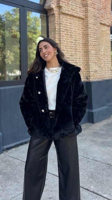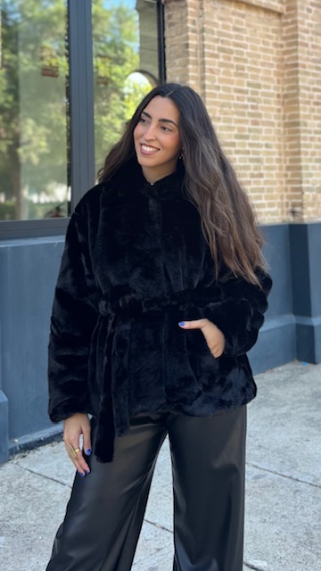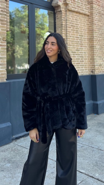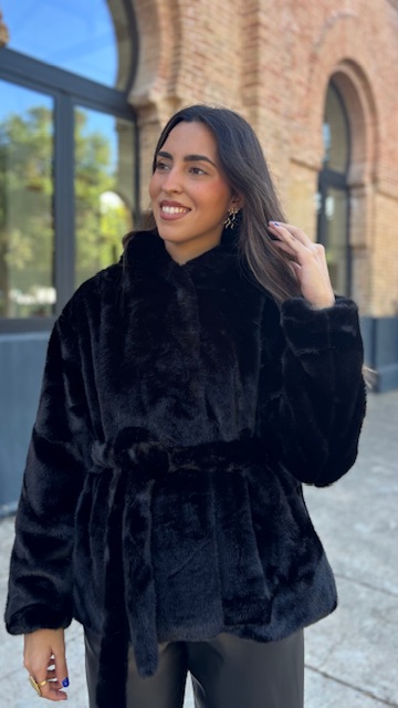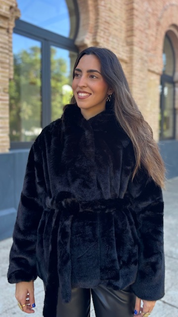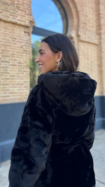 Abrigo de pelo sintético con cinturón y capucha en color negro. Talla única válida desde la 36 hasta 44.