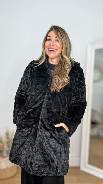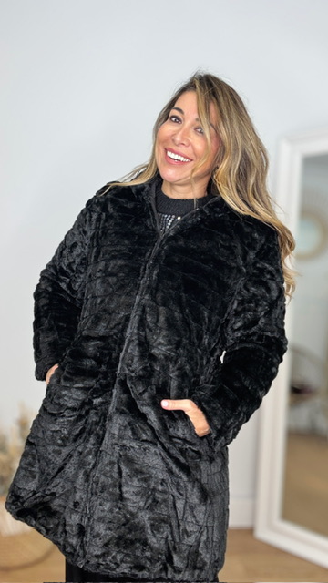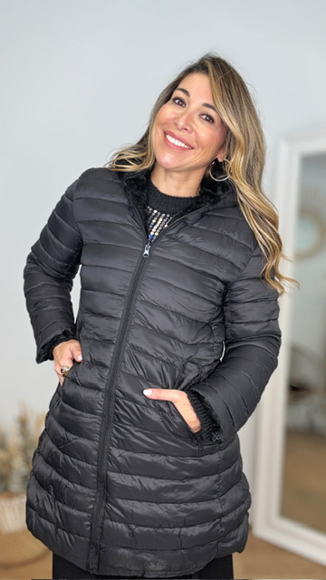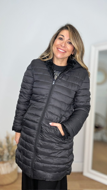 Abrigo reversible con una parte de pelo y otra de plumífero con cremallera delantera y gorro. Disponible por tallas.