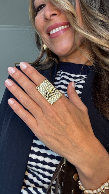 Anillo con forma de rectángulo con relieve en dorado.Graduable.