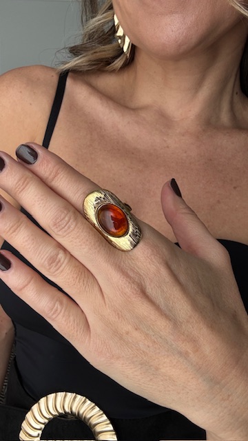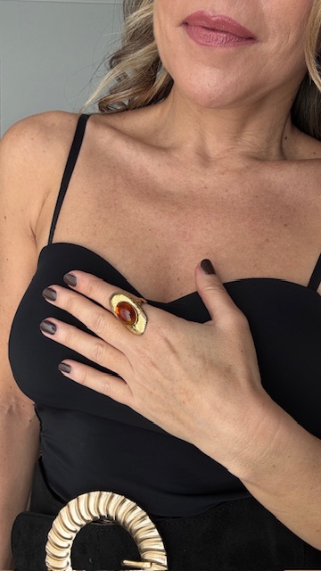 Anillo con forma ovalada con perla carey en el centro en dorado. Ajustable.