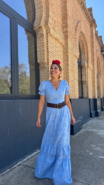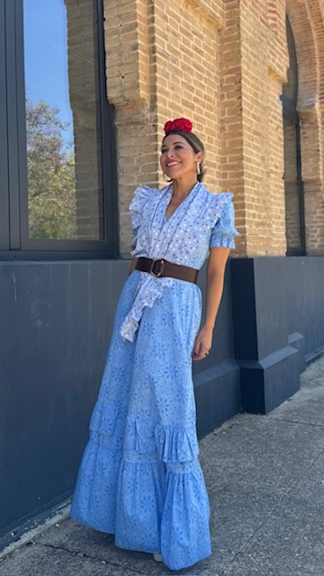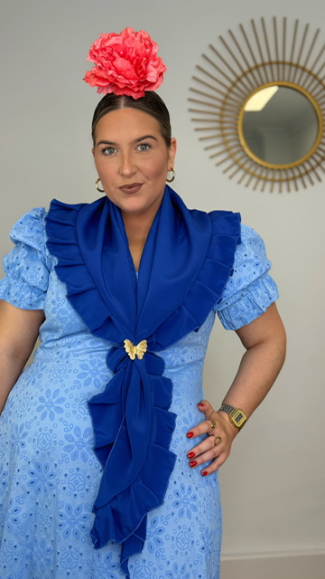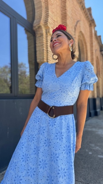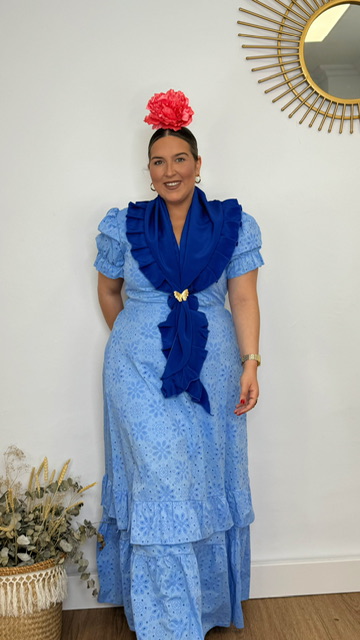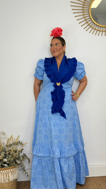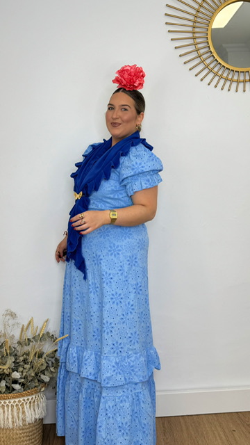 Vestido Bata confeccionada en tejido perforado ideal para romerías en color azul ducado con mangas cortas. Disponible por tallas.