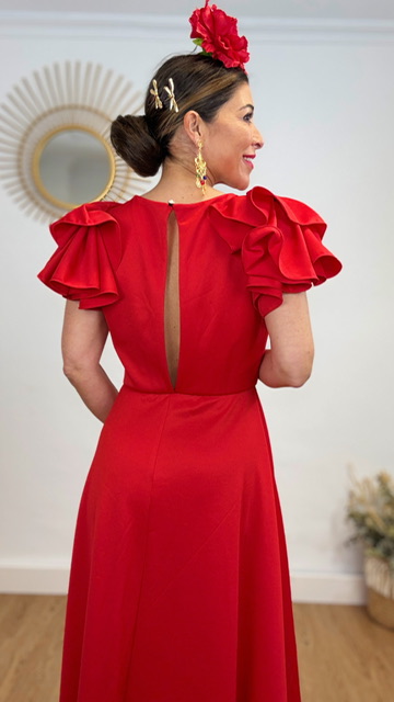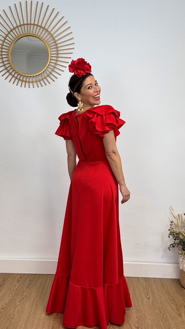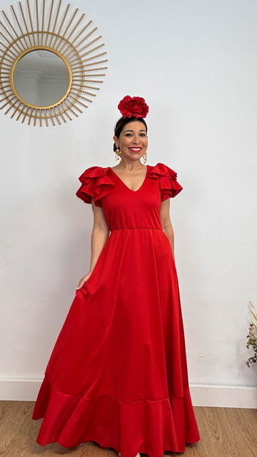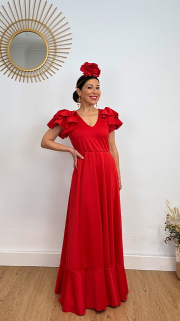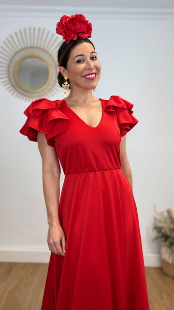 Vestido tipo bata confeccionado en tejido de crepé elástico con volantes en la sisa en color fucsia. Talla única valida desde la 36 hasta la 42.
