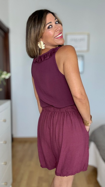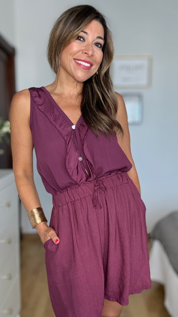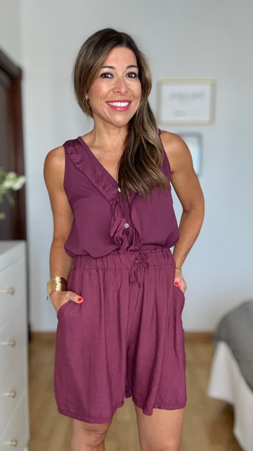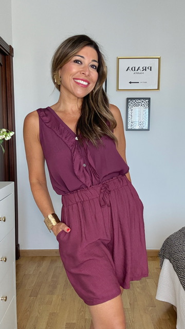 Bermudas confeccionada en tejido simulando el lino en color berenjena. Talla única válida 36 hasta la 40/42.