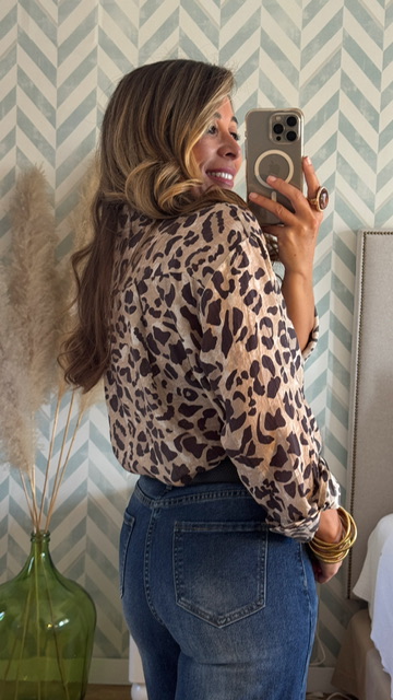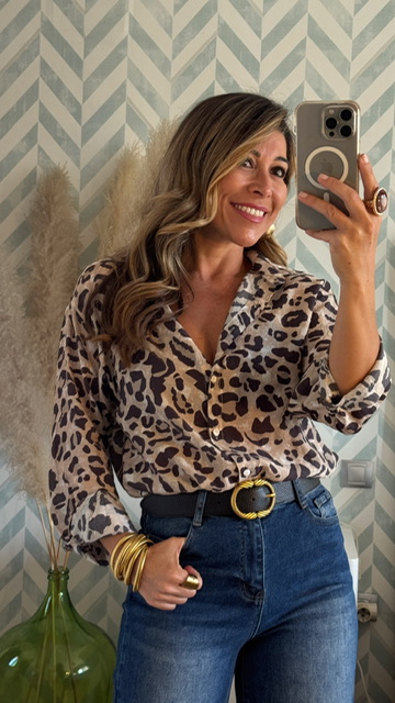 Blusa con estampado animal print confeccionada en tejido de viscosa con botonadura delantera. Disponible por tallas.