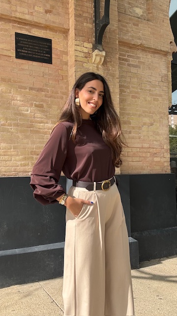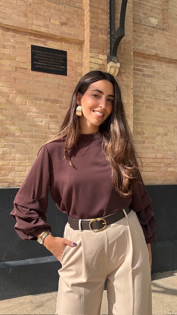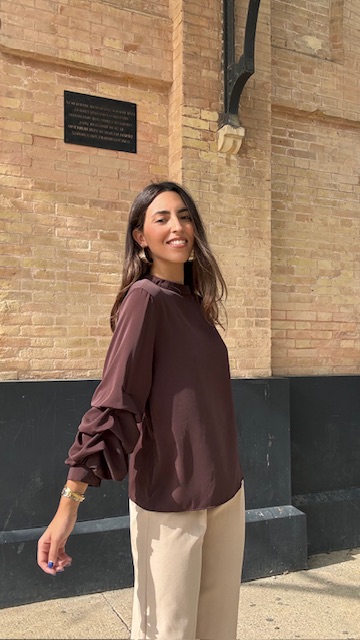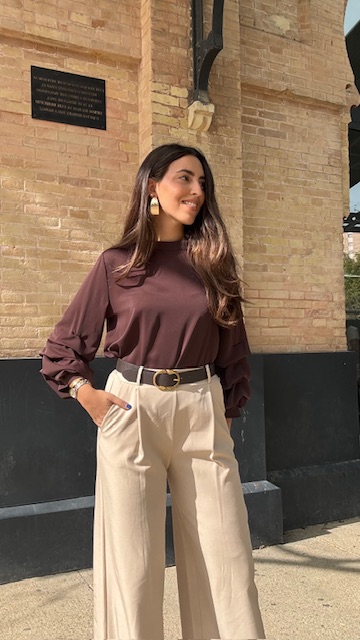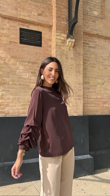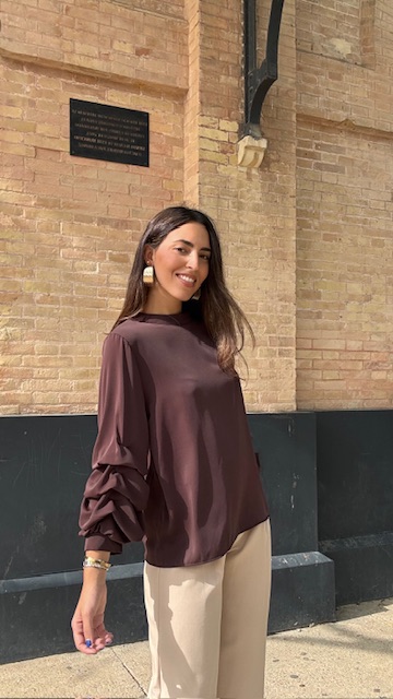 Blusa en color marrón con mangas arrugaditas. Talla única válida desde la 36 hasta la 44.