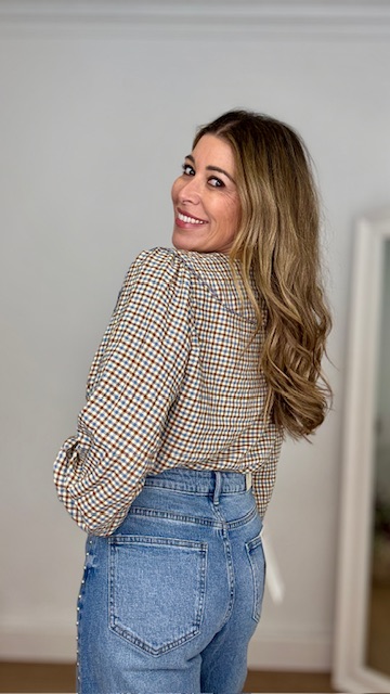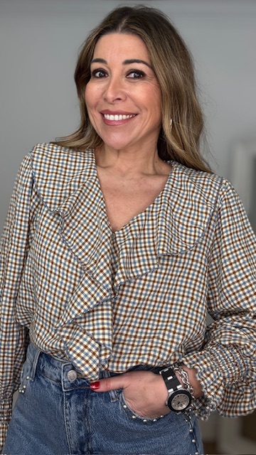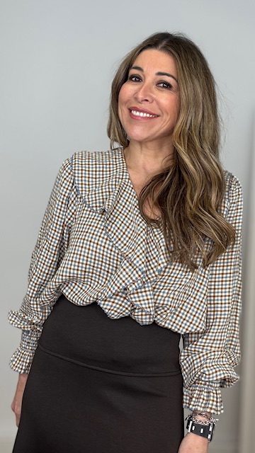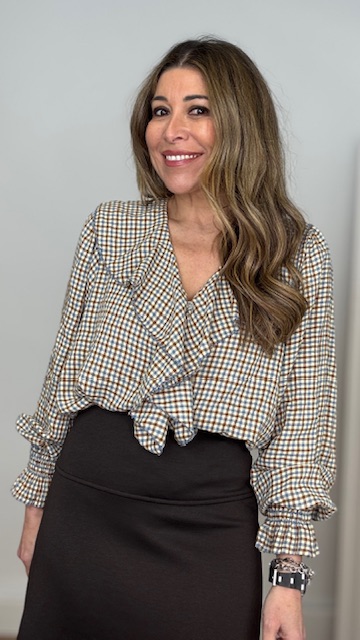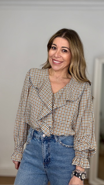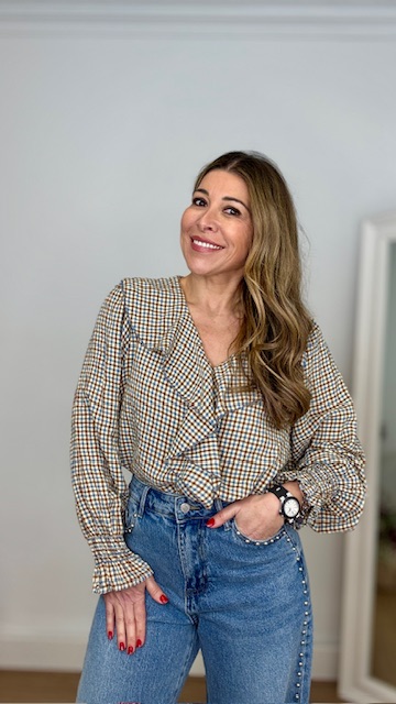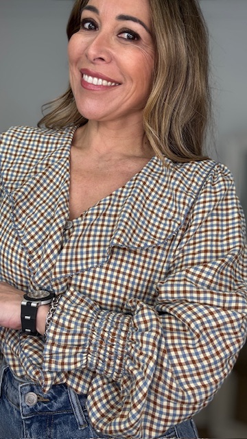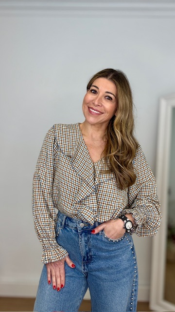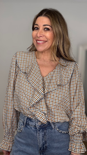 Blusa con estampado de cuadritos con volantito en el escote. Talla única válida desde la 36 hasta la 44.