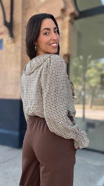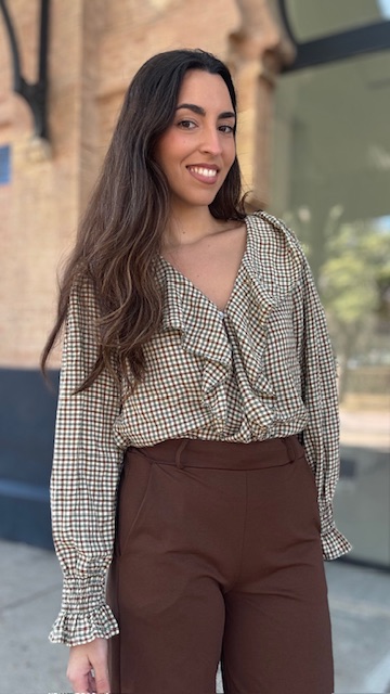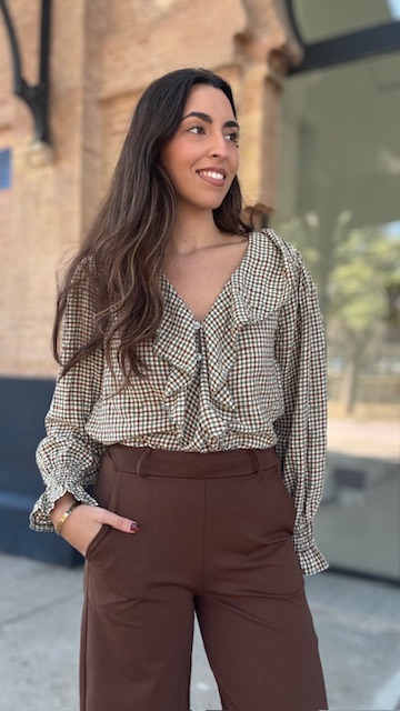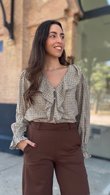 Blusa con estampado de cuadritos con volantito en el escote. Talla única válida desde la 36 hasta la 44.