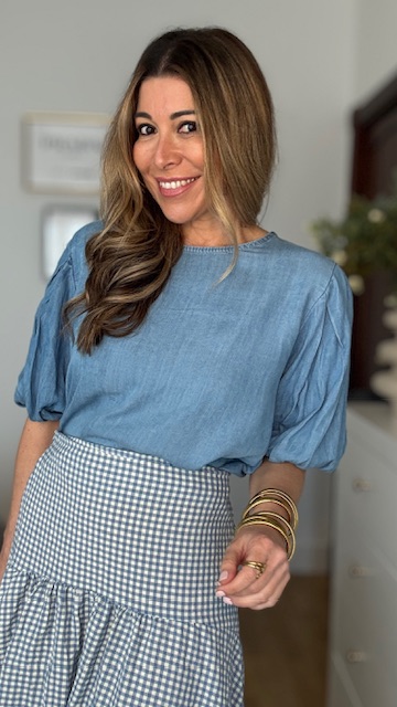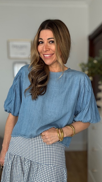 Blusa denim con mangas cortas abullonadas en color azul. Talla única válida desde la talla 36 hasta la talla 44.
