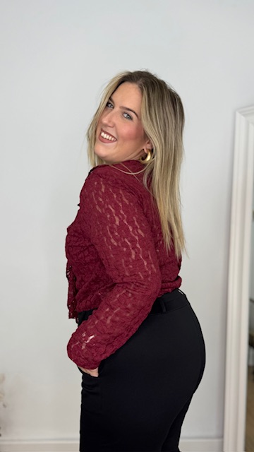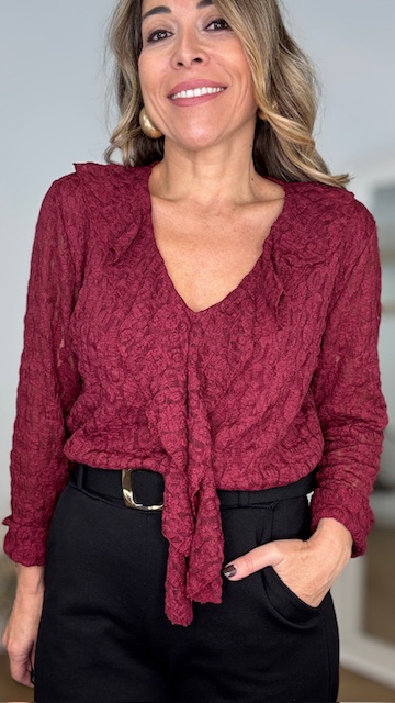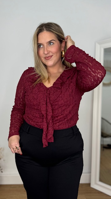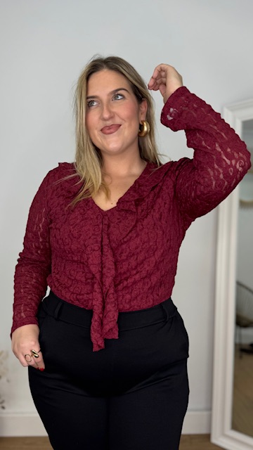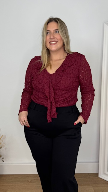 Blusa de encaje en color burdeos con escote tipo V y manga larga. Talla única válida desde la 36 hasta la 44.