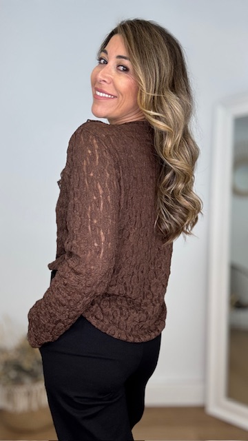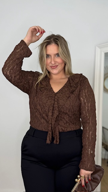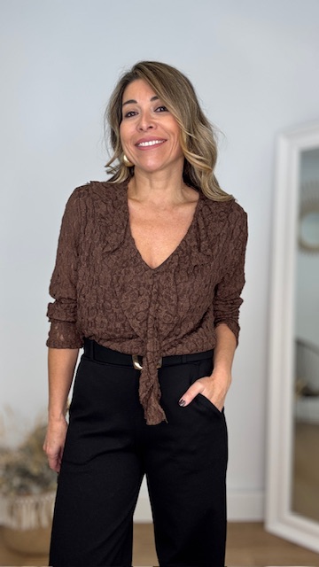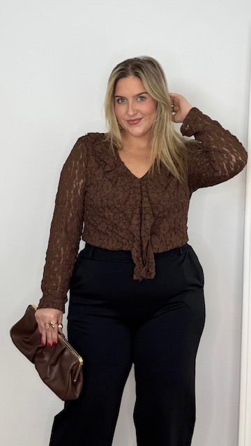 Blusa de encaje en color marrón con escote tipo V y manga larga. Talla única válida desde la 36 hasta la 44.