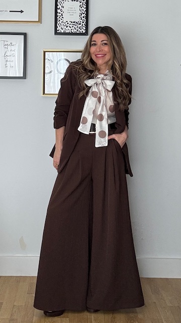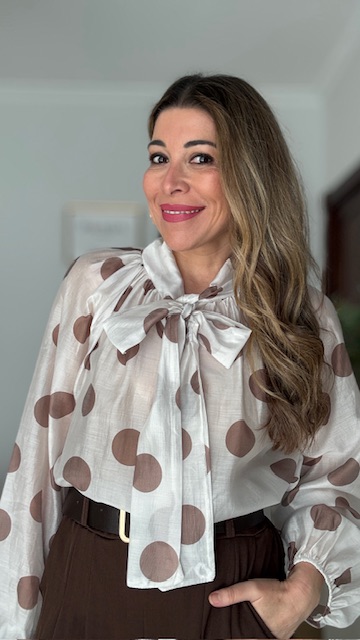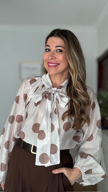 Blusa confeccionada en tejido de gasa en color beige con estampado de lunares en color marrón con lazada. Talla única válida desde la 36 hasta la 44.