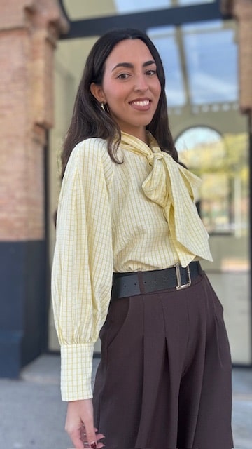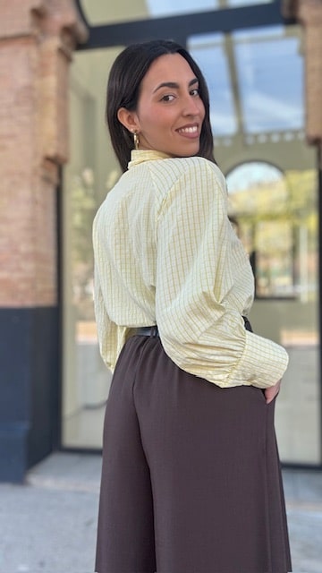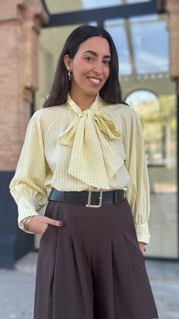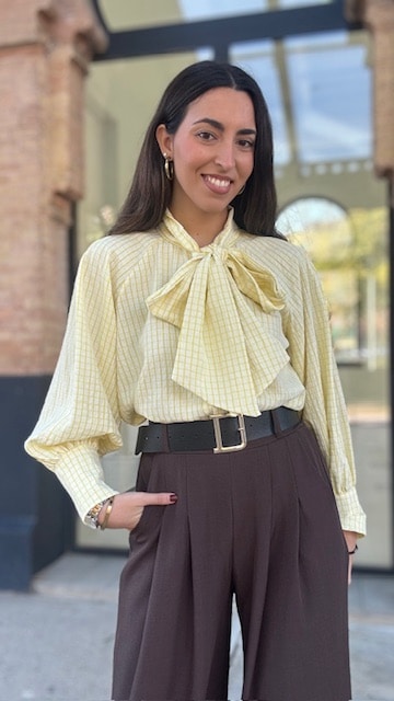 Camisa con lazada con estampado de cuadros en color amarillo pastel. Talla única válida desde la 36 hasta la 44.