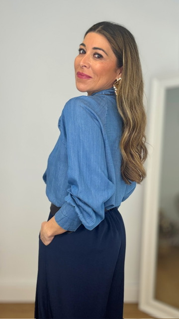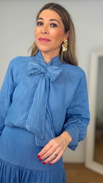 Blusa denim con lazada en la parte del cuello. Talla única válida desde la 36 hasta la 42/44.
