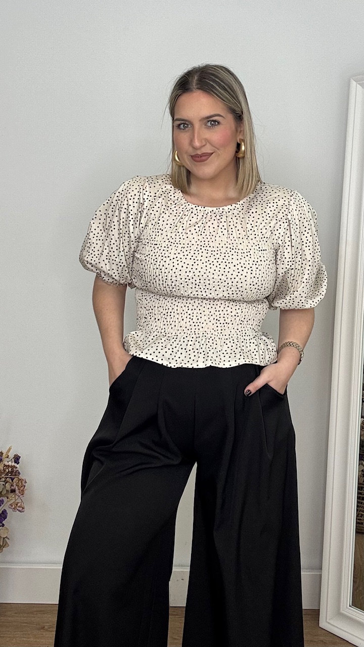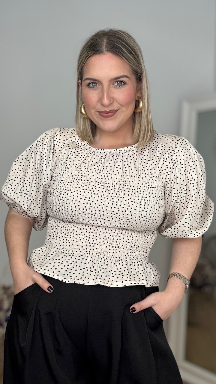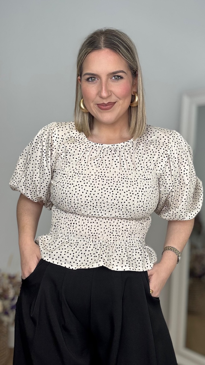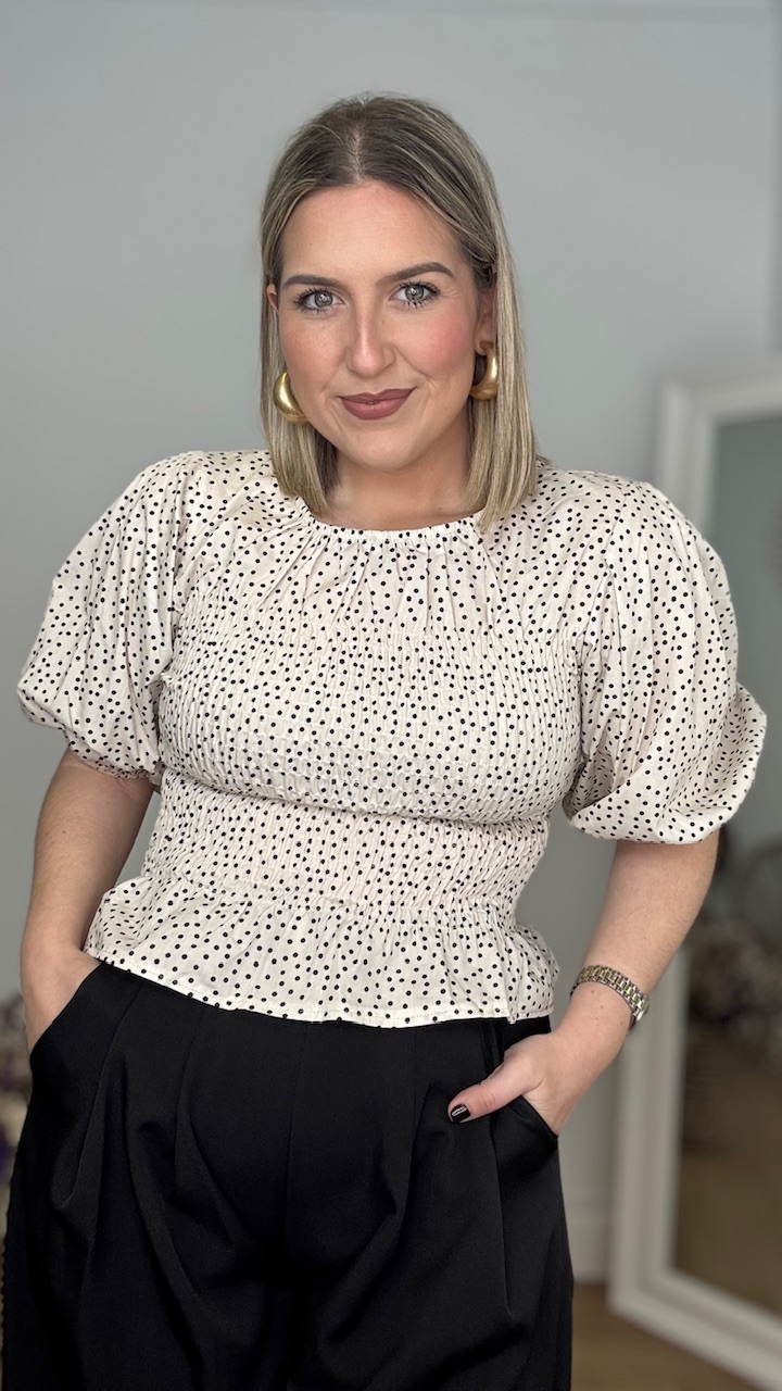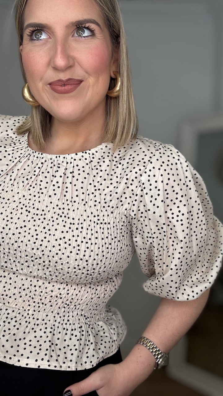 Blusa en color beige con estampado de lunares en color negro y con mangas abullonadas. El cuerpo de la blusa es de nido de abeja. Talla única válida desde la talla 36 hasta la talla 44.