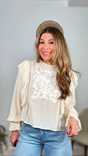 Blusa en color beige con detalles bordados en pecherín. Tallas SMLXL