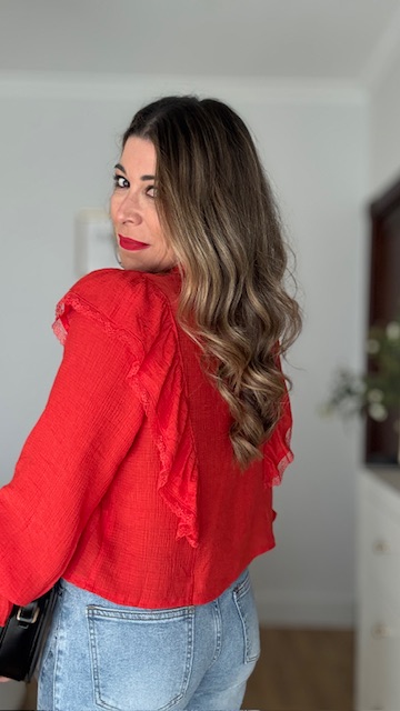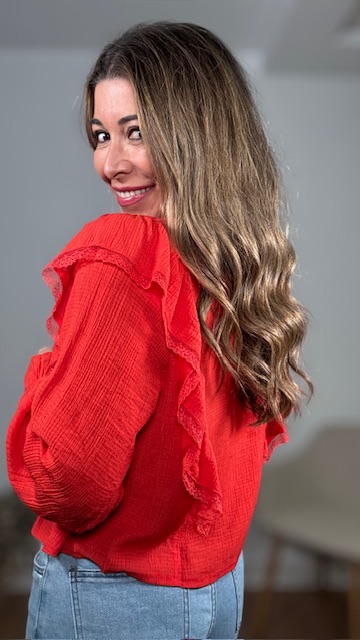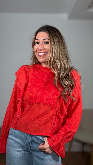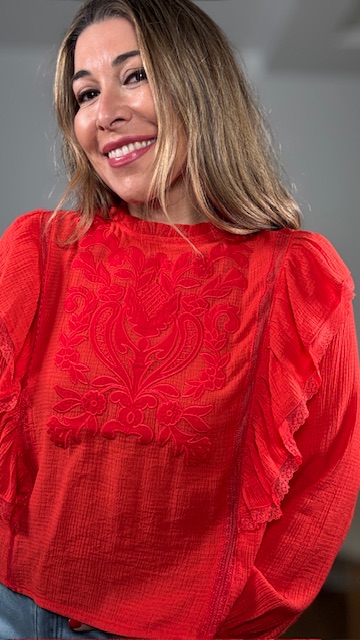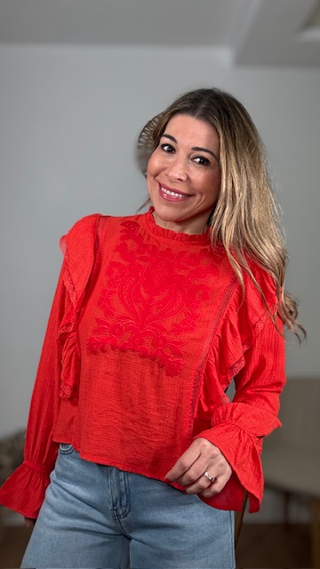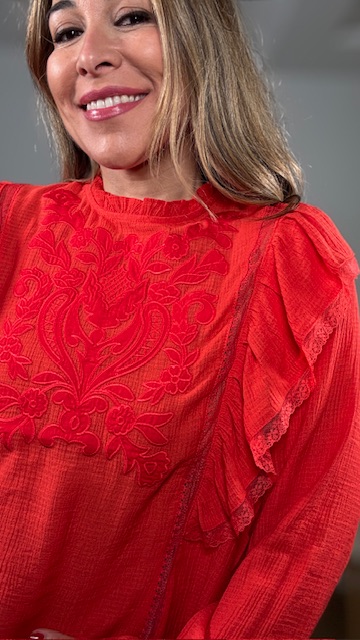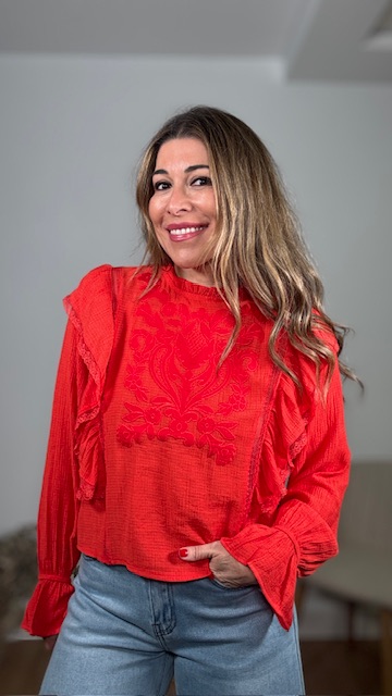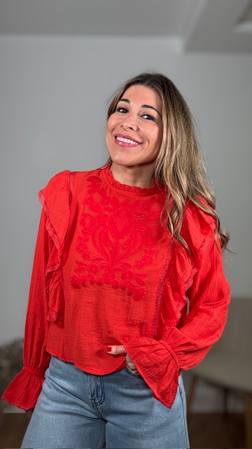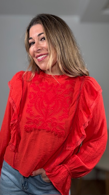 Blusa en color rojo con detalles bordados en pecherín. Tallas SMLXL