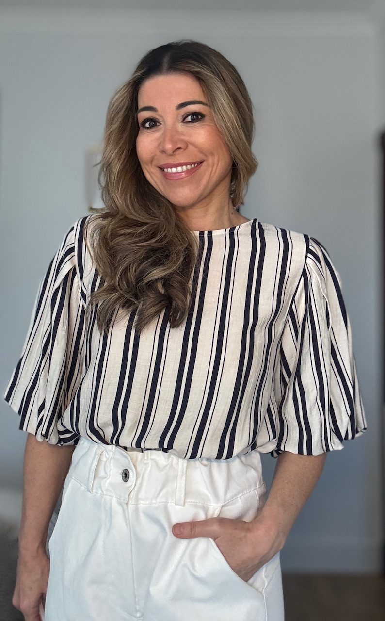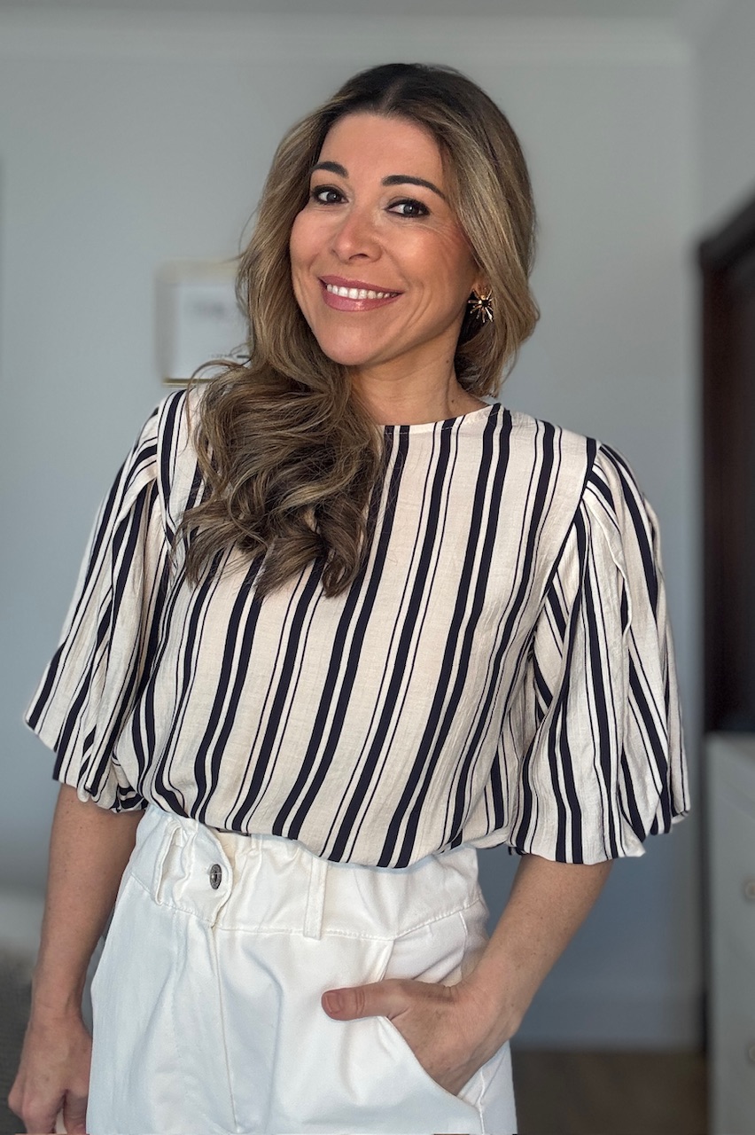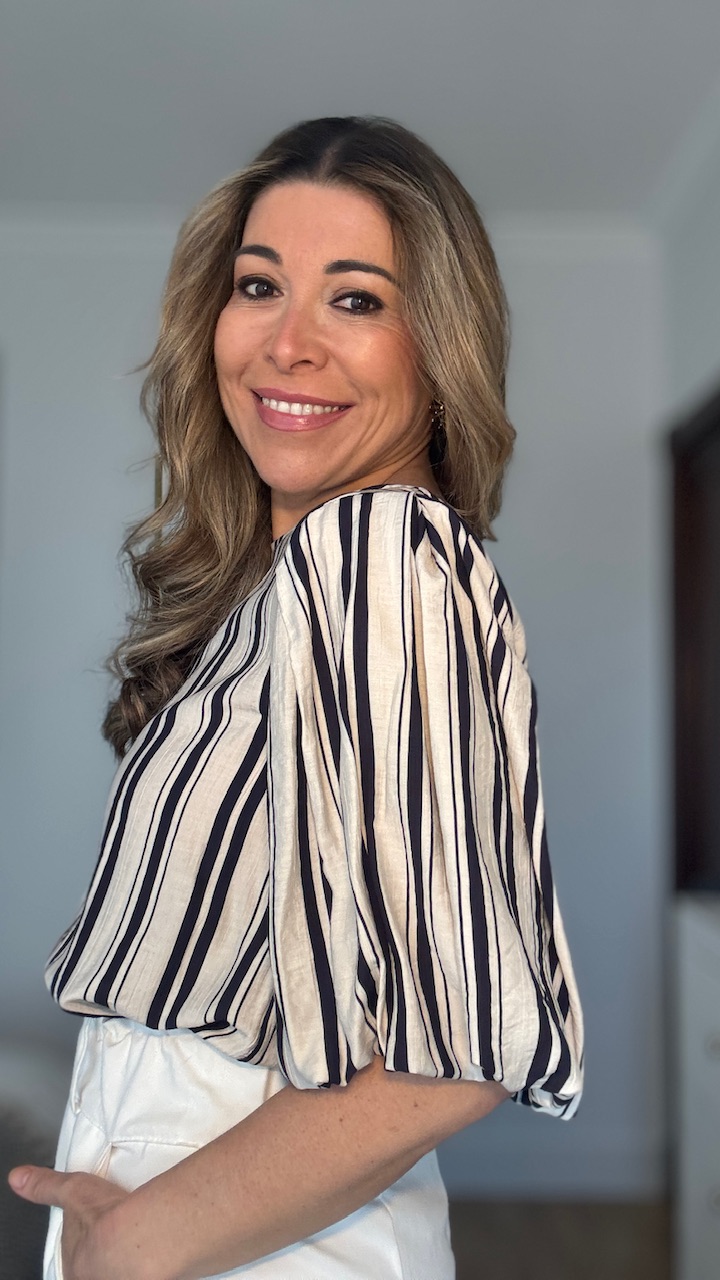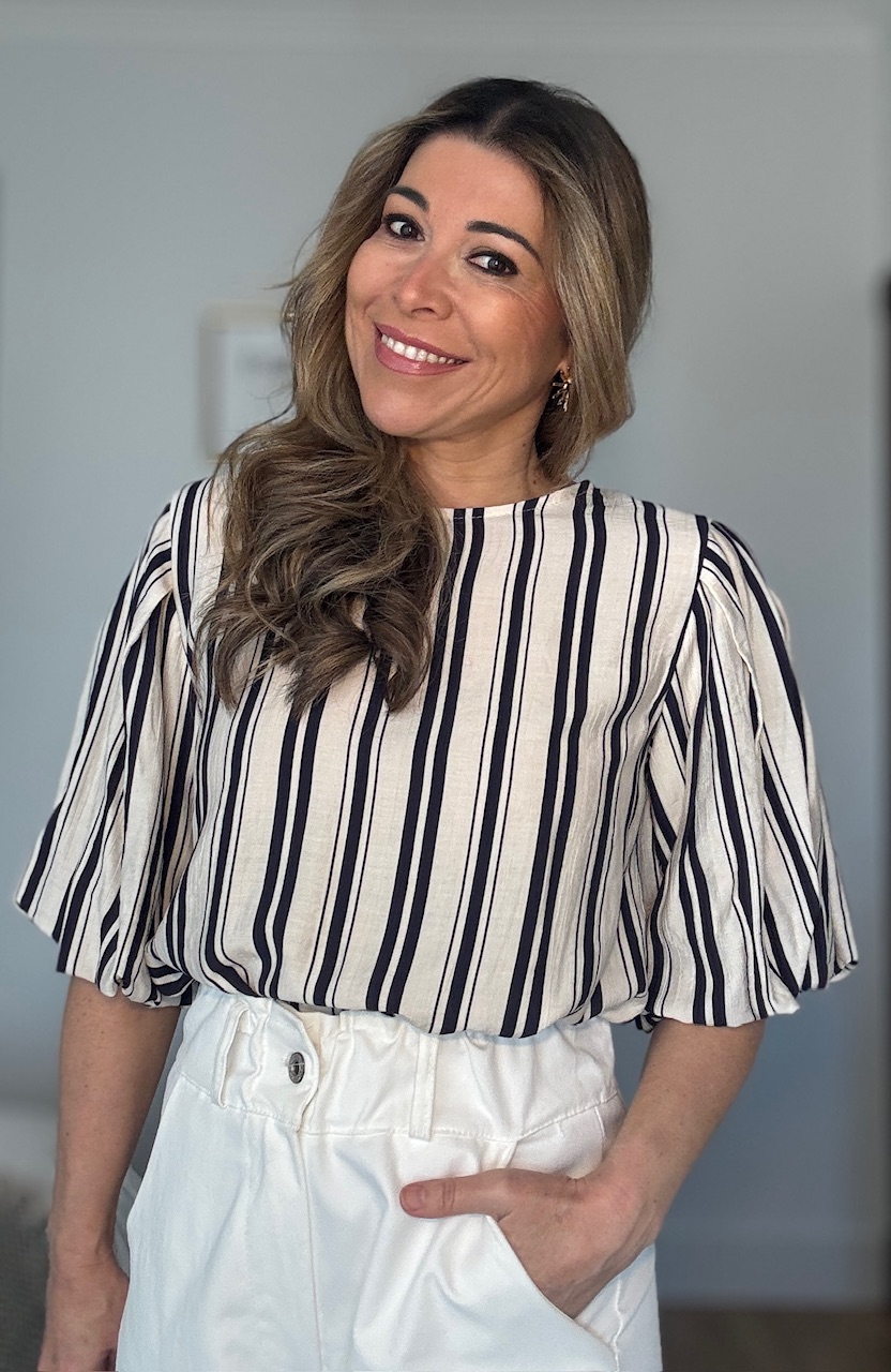 Blusa en color beige con estampado de rayas verticales en color azul marino con mangas abullonadas. Talla única válida desde la talla 36 hasta la talla 44.