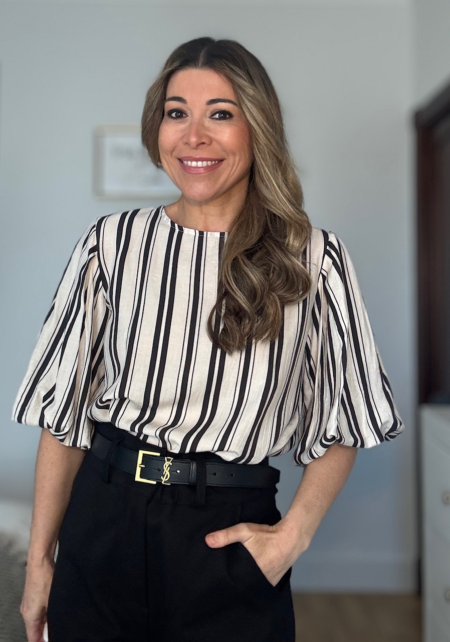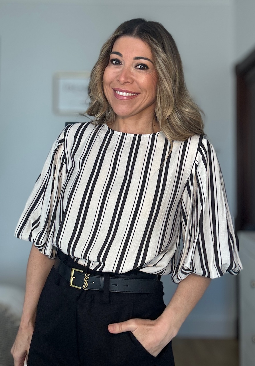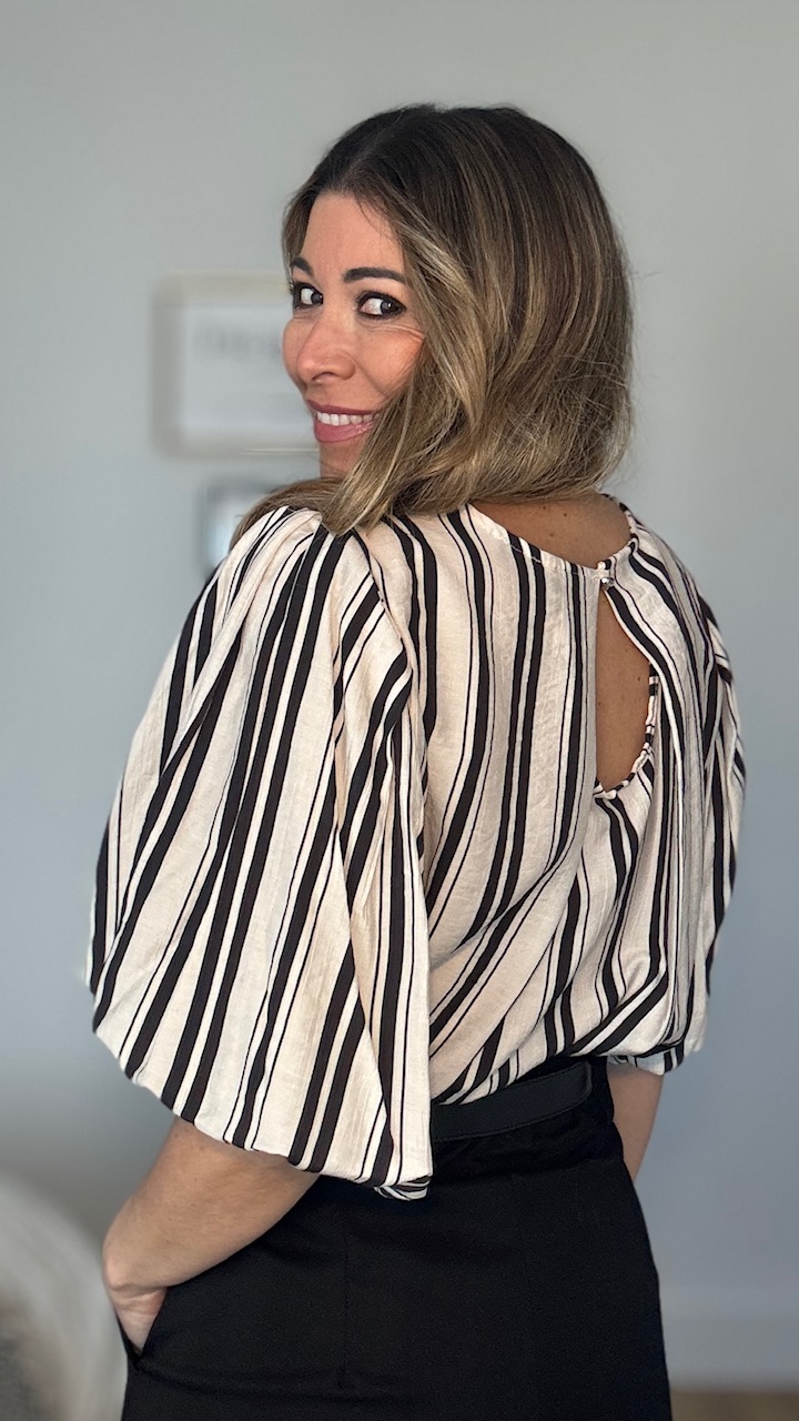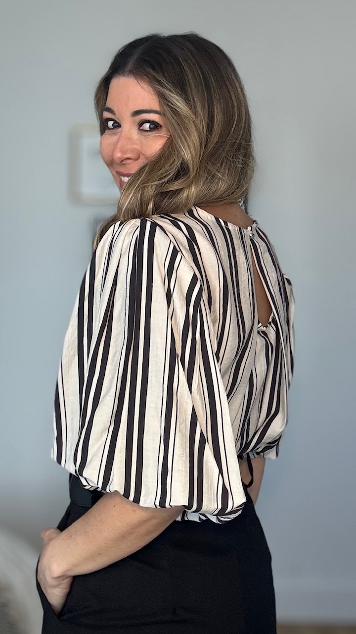 Blusa en color beige con estampado de rayas verticales en color negro con mangas abullonadas. Talla única válida desde la talla 36 hasta la talla 44.