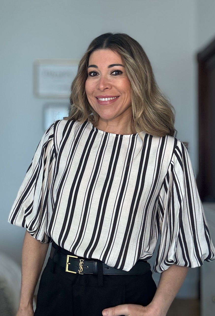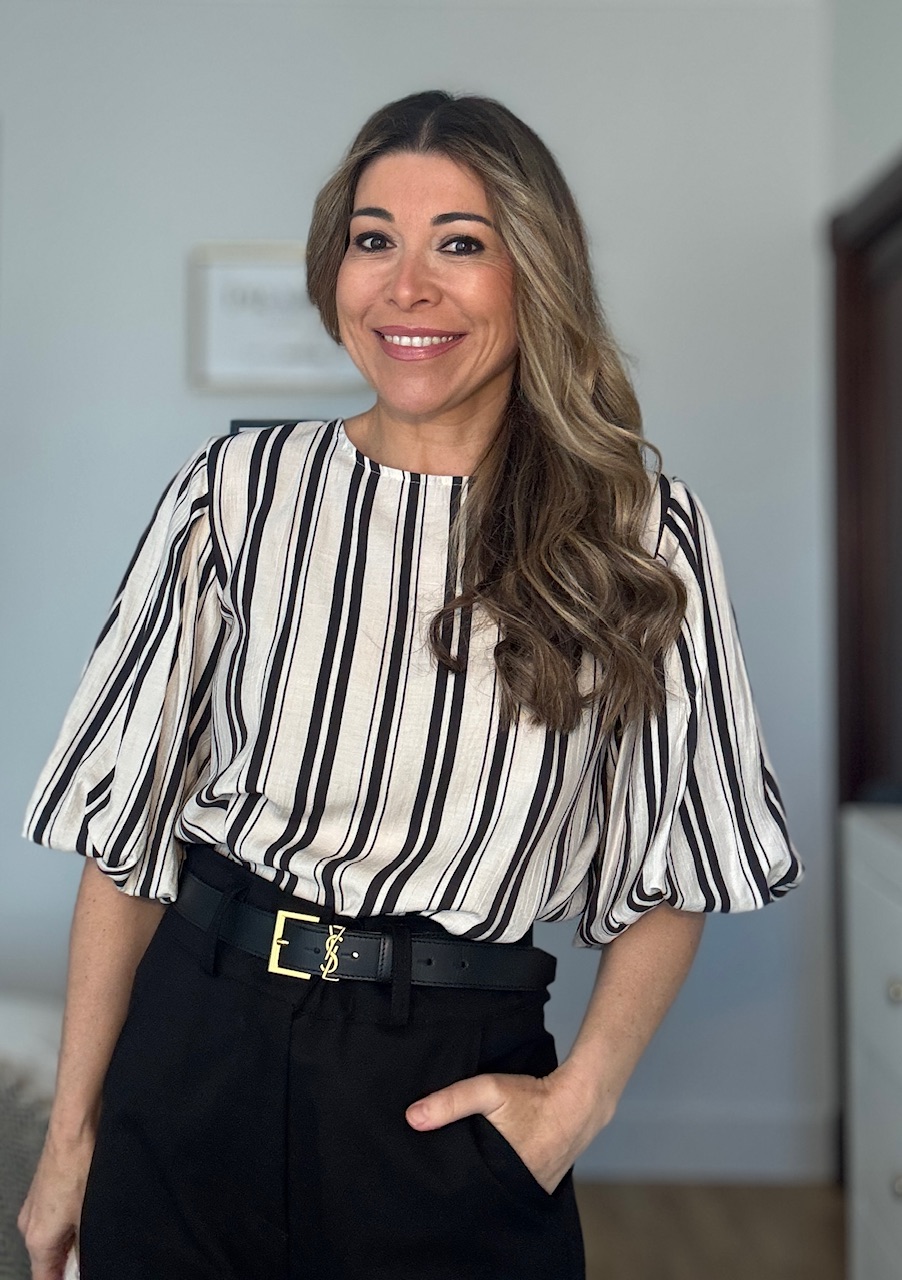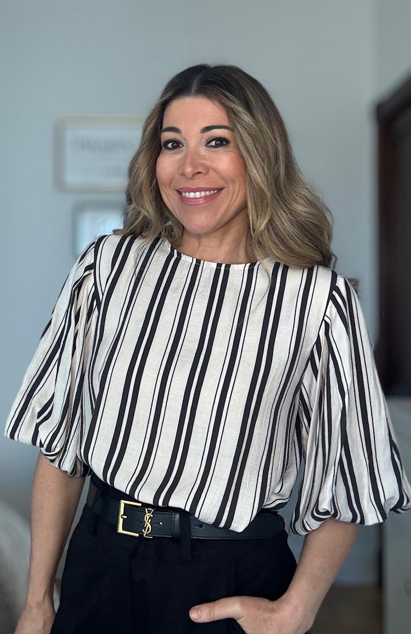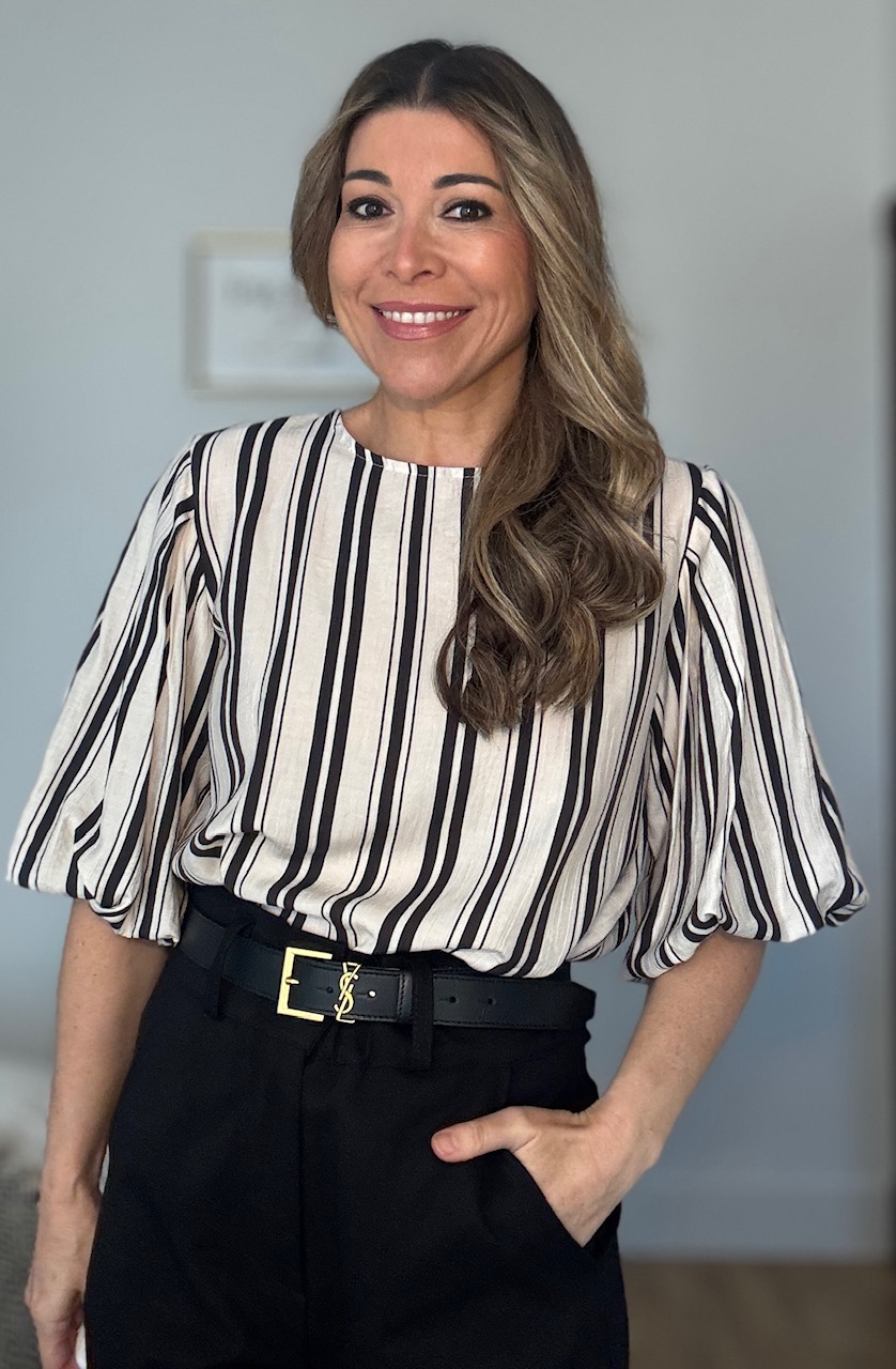 Blusa en color beige con estampado de rayas verticales en color negro con mangas abullonadas. Talla única válida desde la talla 36 hasta la talla 44.