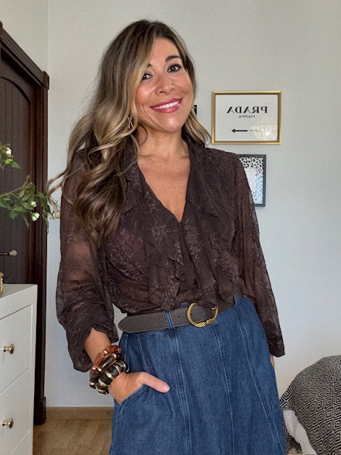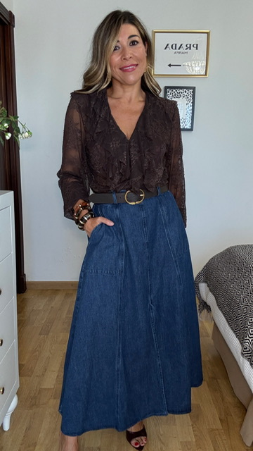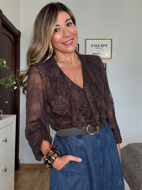 Blusa de encaje con volantes en la parte delantera y manga larga. Talla única válida desde la 36 hasta la 40/42.