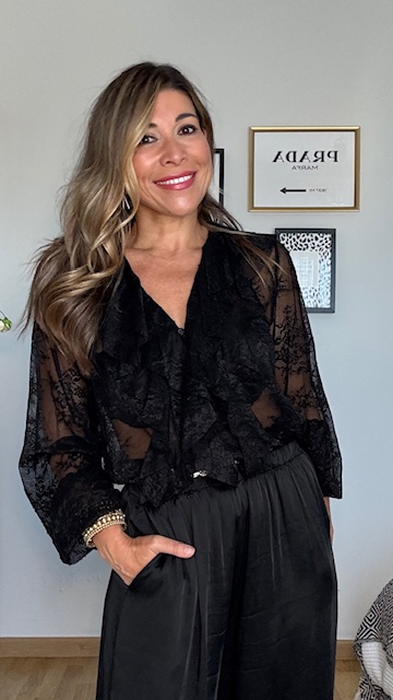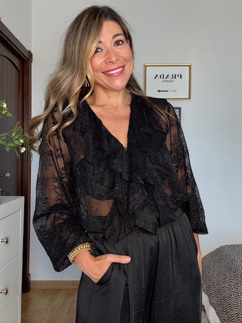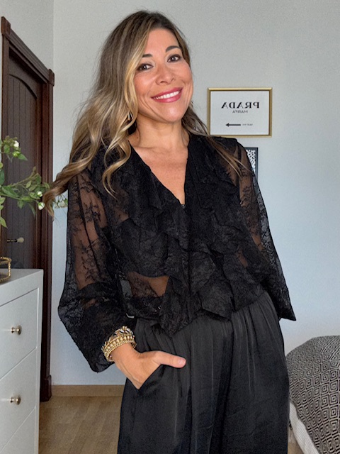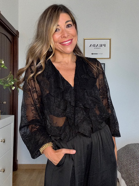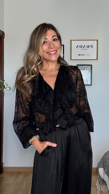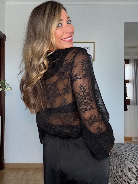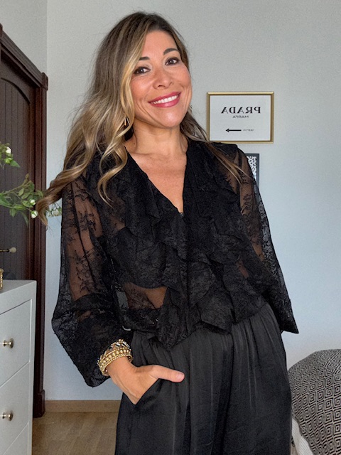 Blusa de encaje con volantes en la parte delantera y manga larga. Talla única válida desde la 36 hasta la 40/42.