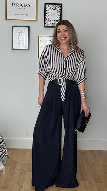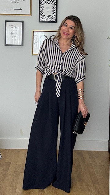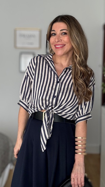 Blusa de media manda con estampado de rayas en beige y azul marino con botonadura delantera y nudo. Talla única válida desde la 36 hasta la 42/44.