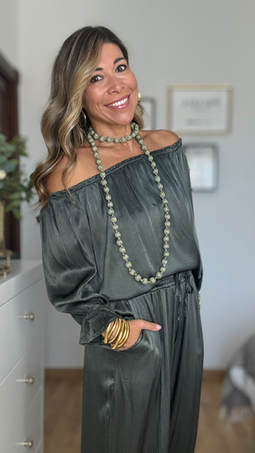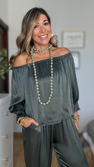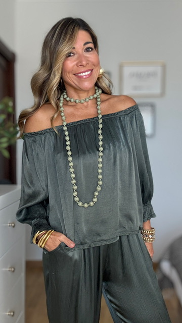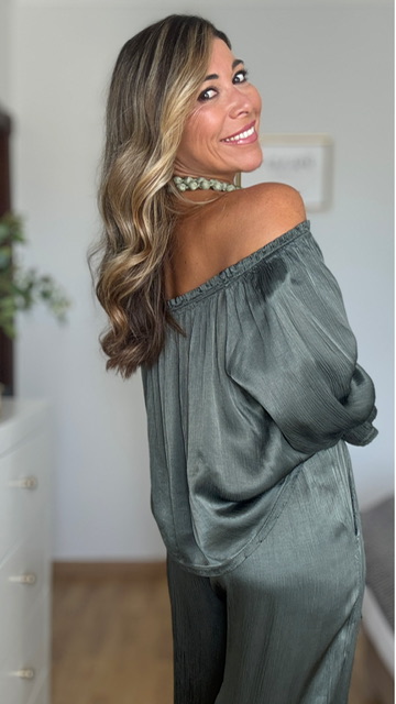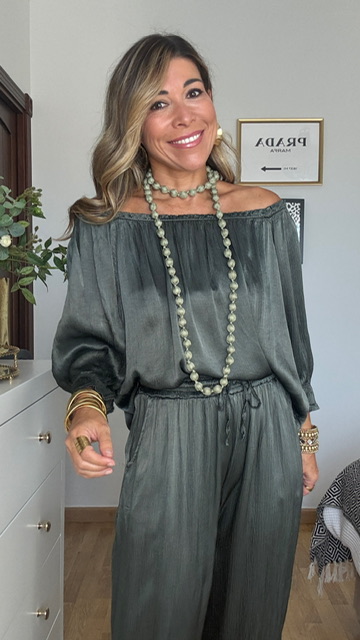 Blusa satinada con una leve tramita en el tejido que le da un toque diferente, disponible en color caza y con escote elástico estilo barco. Talla única válida desde la 36 hasta la 44. Lo puedes combinar con el pantalón Frida.