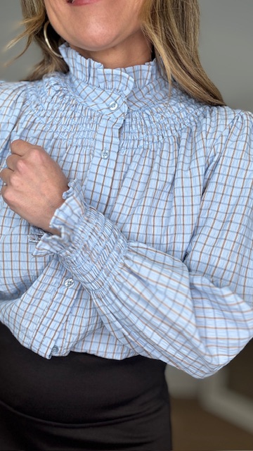 Blusa con estampado de cuadritos en color celeste. Talla única válida desde la 36 hasta la 44.
