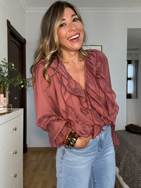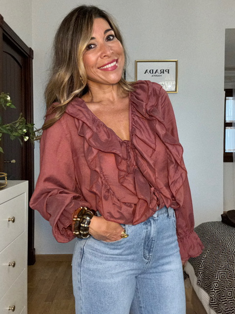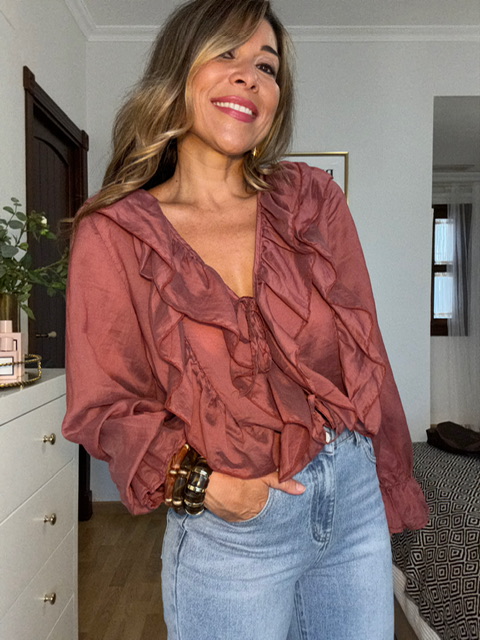 Blusa con volantes en la parte delantera y trasera en color teja. Talla única válida desde la 36 hasta la 42.