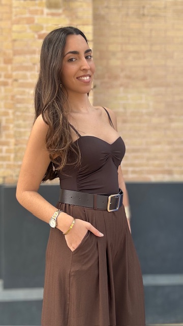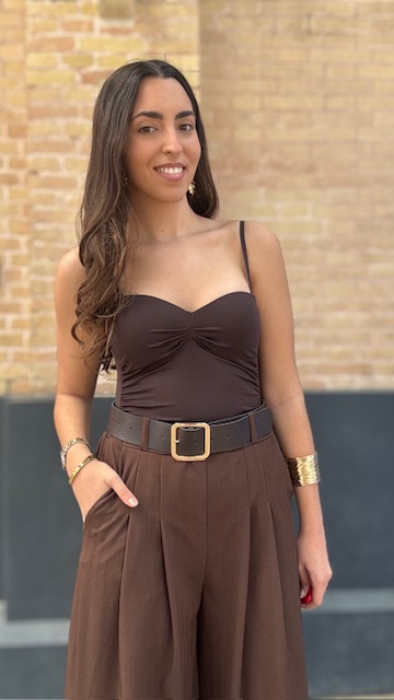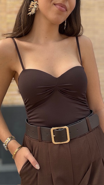 Body en color marrón confeccionado en tejido de licra elástica con escote tipo corazón y tirantes regulables. Talla única válida desde la talla 36 hasta la talla 40/42.