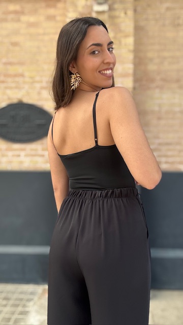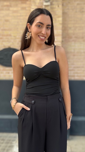 Body en color negro confeccionado en tejido de licra elástica con escote tipo corazón y tirantes regulables. Talla única válida desde la talla 36 hasta la talla 40/42.