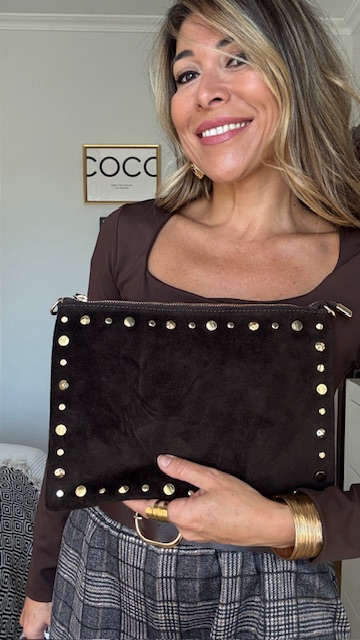Bolso de antelina negro con tachas. Lleva correa para bandolera.