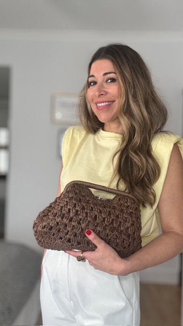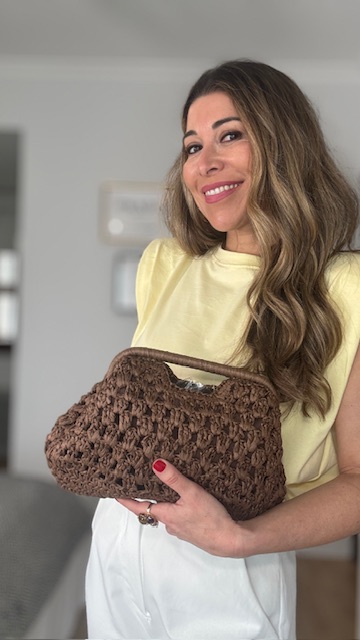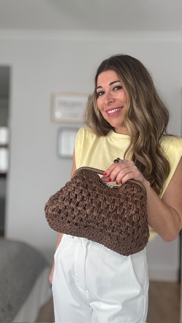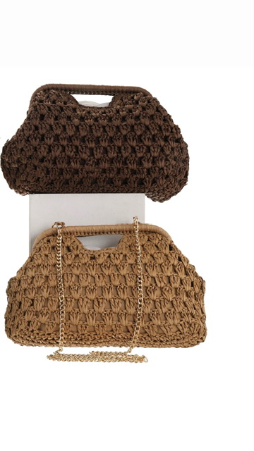 Bolso de rafia con trenzado en color marrón chocolate. Es un bolso tanto para utilizar de mano como para utilizarlo de bandolera (trae cadena dorada). Interior forrado.