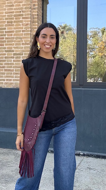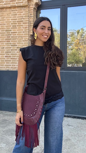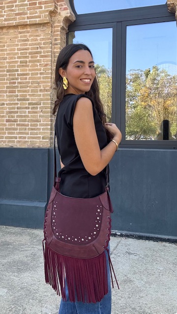 Bolso bandolera de polipiel con flecos en color burdeos.