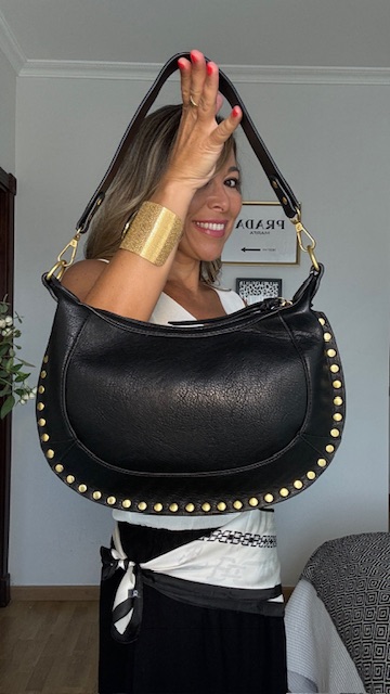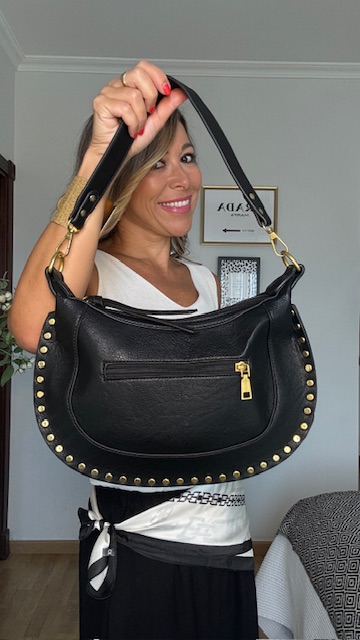 Bolso de hombro confeccionado en polipiel de color negro con tachuelas doradas. Asa al hombro y lleva asa larga en el interior. Cierre con cremallera y lleva bolsillo exterior.