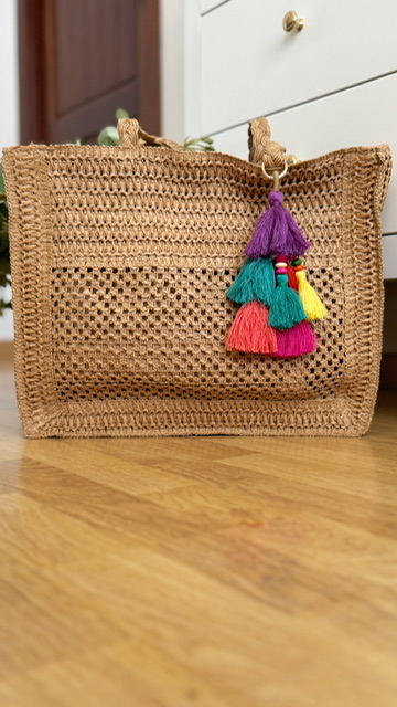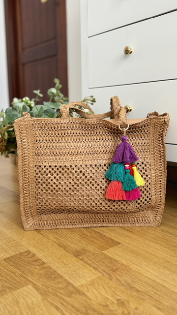 Bolso de rafia en color camel con borlones de colores. Tamaño mediano.