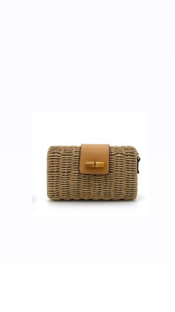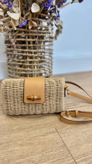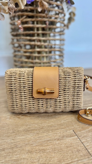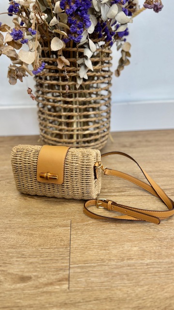 Bolso de rafia trenzada en color camel con correa en camel ajustable . Con solapa en color camel y detalle de bambú en el cierre.