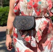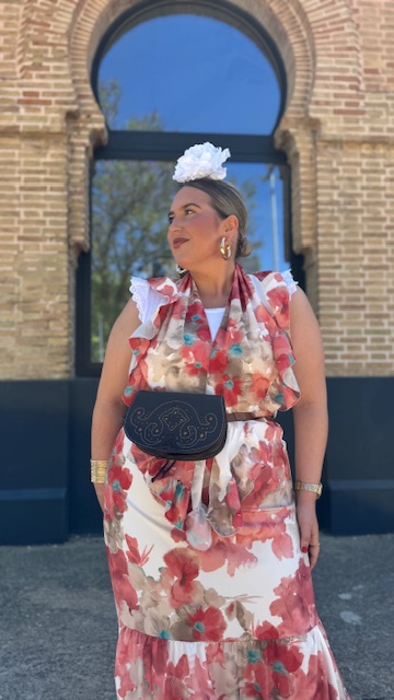 Bolso rociero que sirve tanto para bandolera como para riñonera en color marrón oscuro con fondo en mostaza.