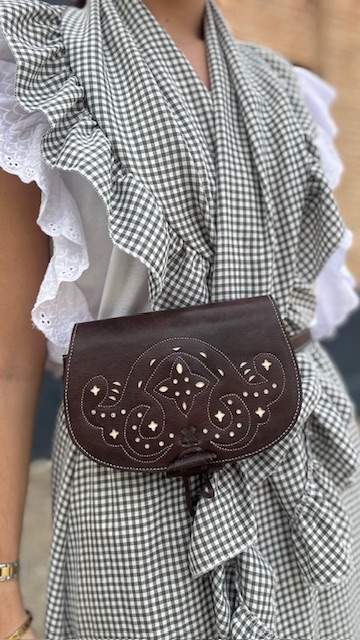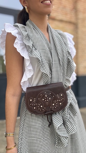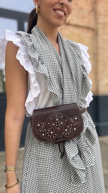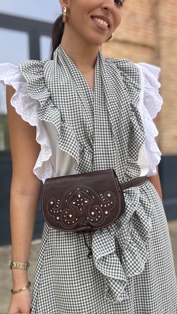 Bolso rociero que sirve tanto para bandolera como para riñonera en color marrón oscuro con fondo en blanco.