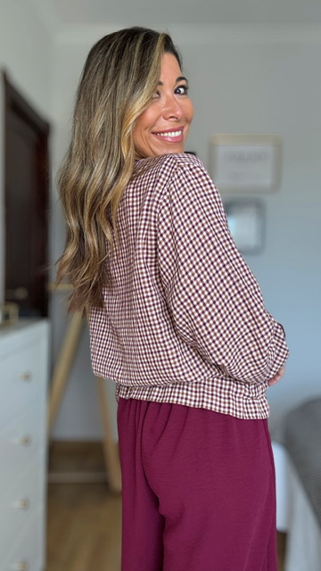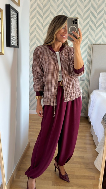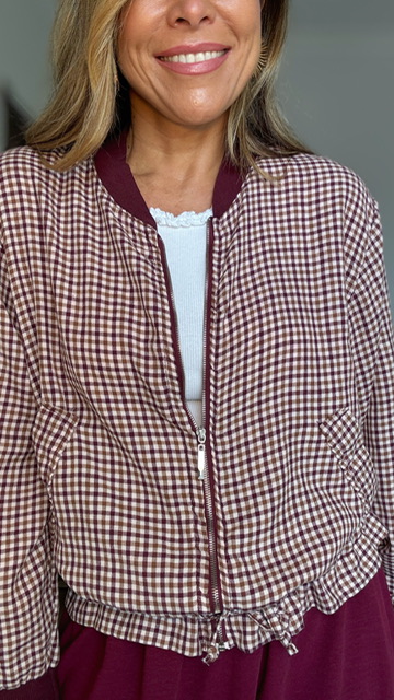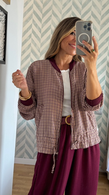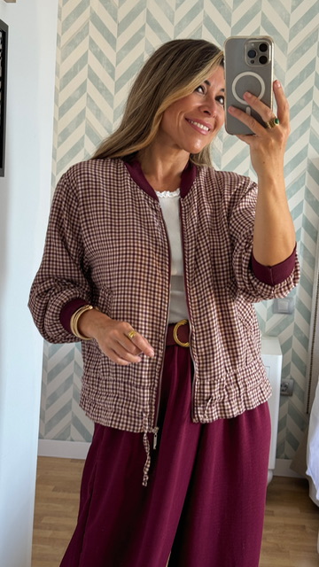Bomber de cuadritos en tonos beige combinados con burdeos. cierre con cremallera y puños y cuello en burdeos. Talla única válida desde la 36 hasta la 42/44