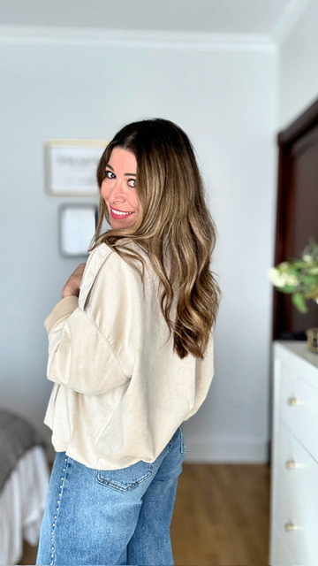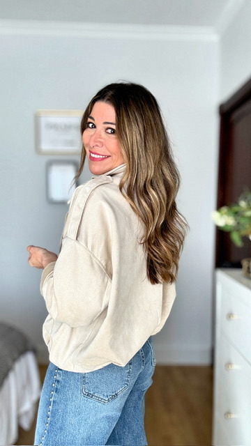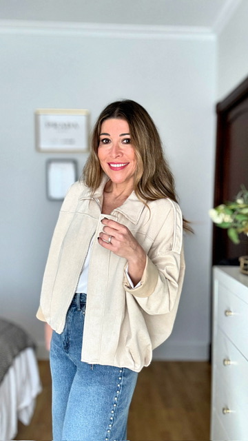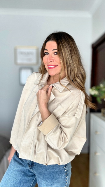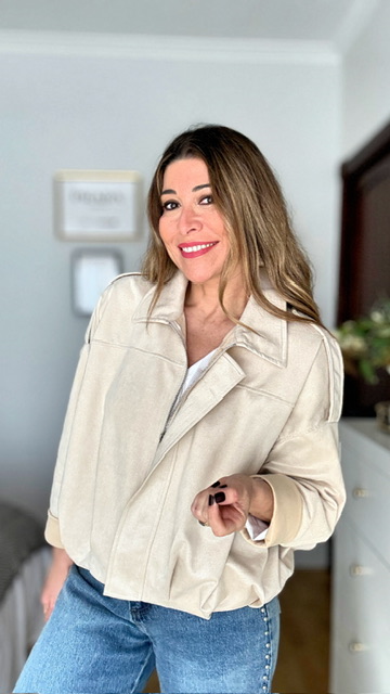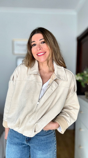 Chaqueta tipo bomber abullonada confeccionada en tejido de antelina en color beige. Lleva cremallera central en color plateada. Talla única válida desde la 36 hasta la 44.