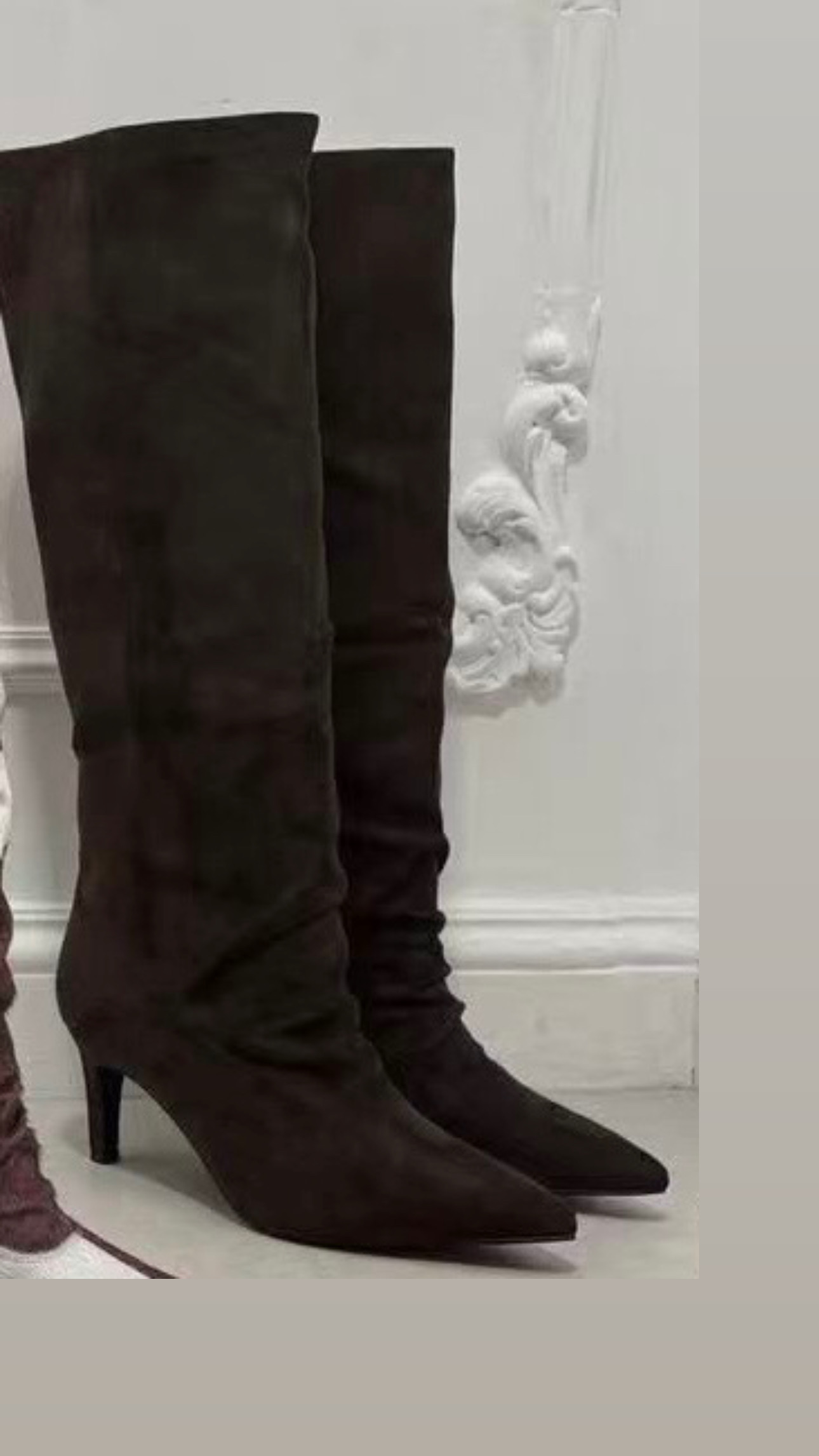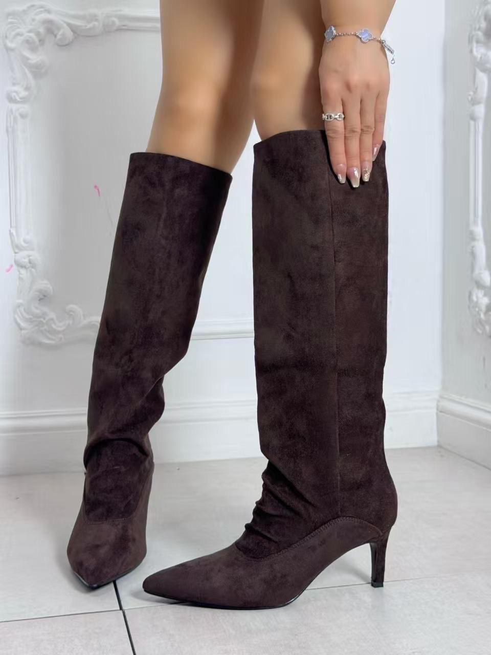 Botas de antelina en color marrón chocolate con una tacón de 5,5 cm y un ancho de caña de 40 cm de contorno