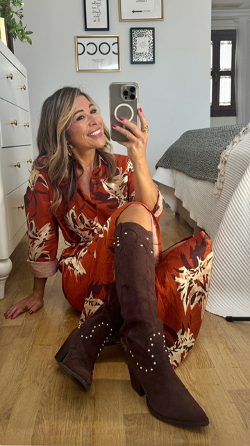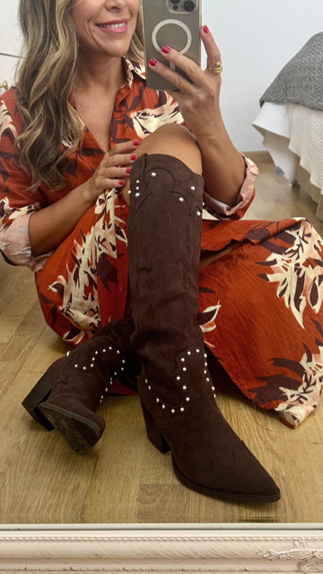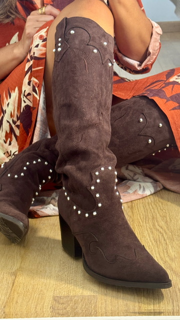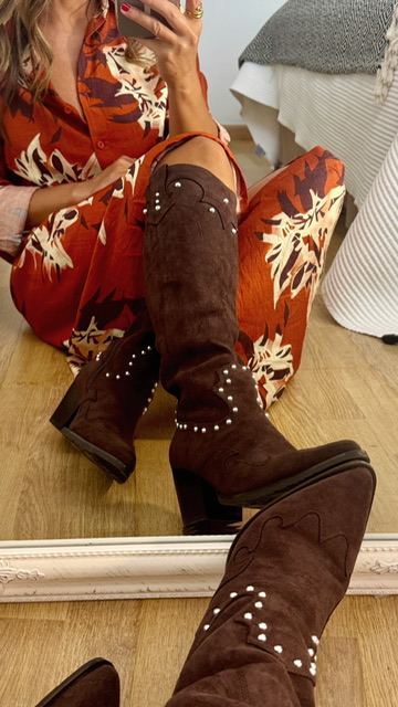 Botas cowboy en color marrón con tachas en color plateado. Tallan normal. Tacón 7,5 cm caña 18 cm
