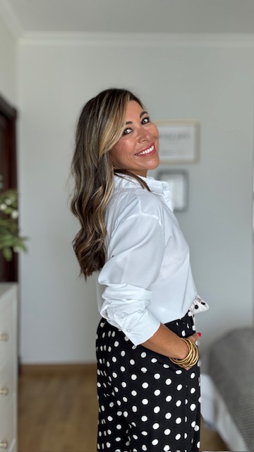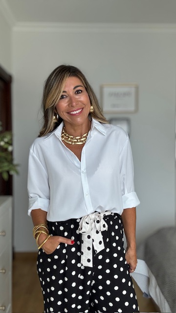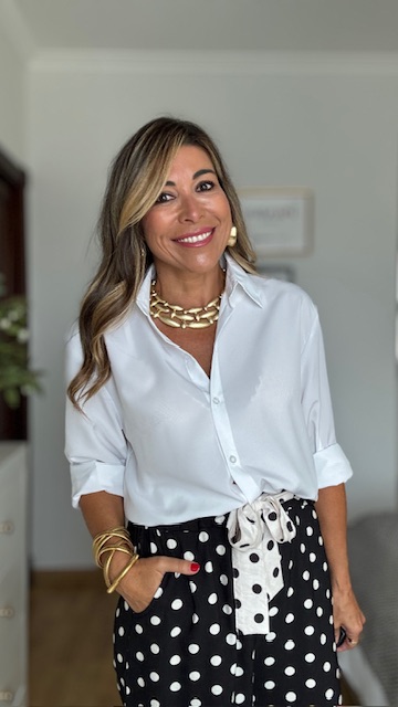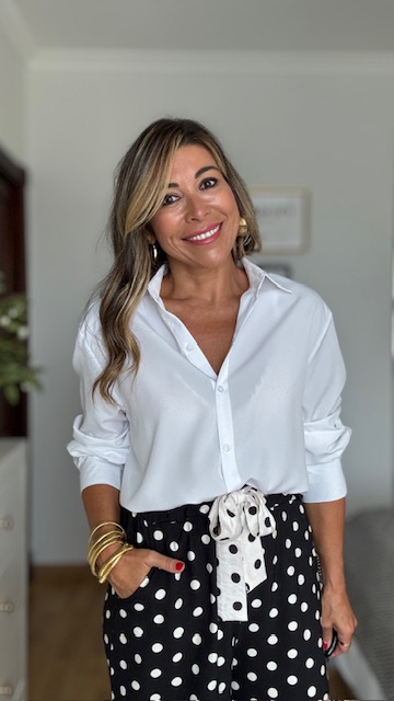 Camisa blanca confeccionada en tejido fluido con mucha caída y tacto sedoso, lleva corte clásico con botonadura delantera y manga larga. Disponible en tres tallas: M L XL.