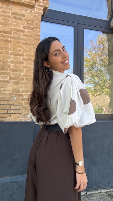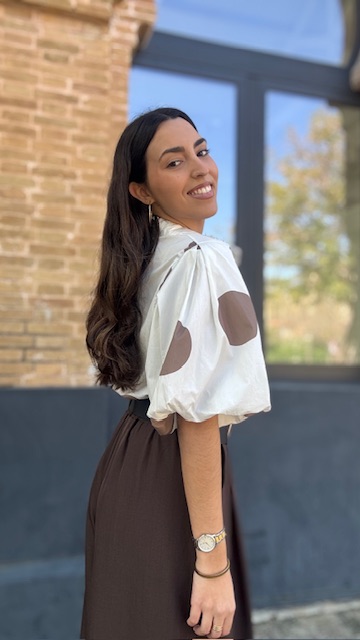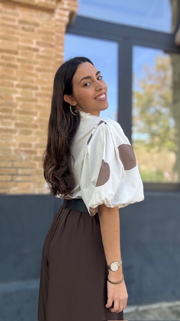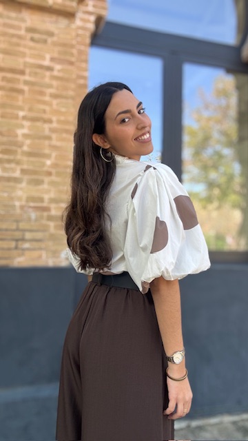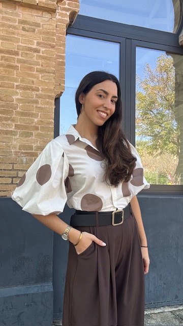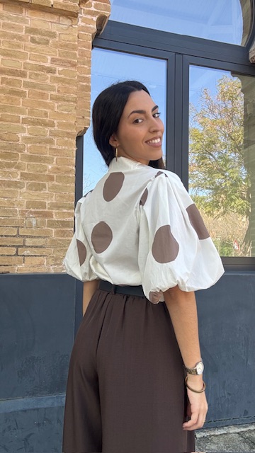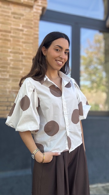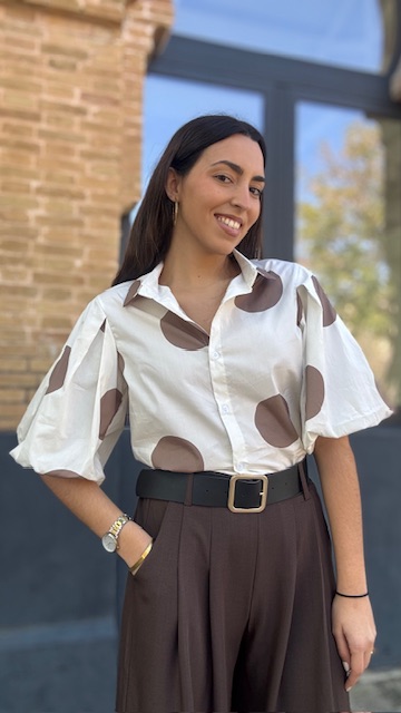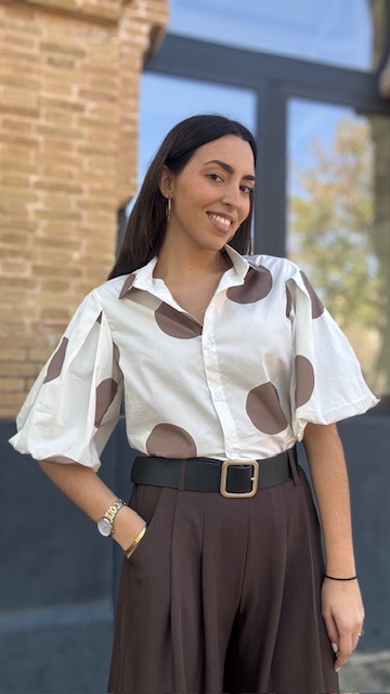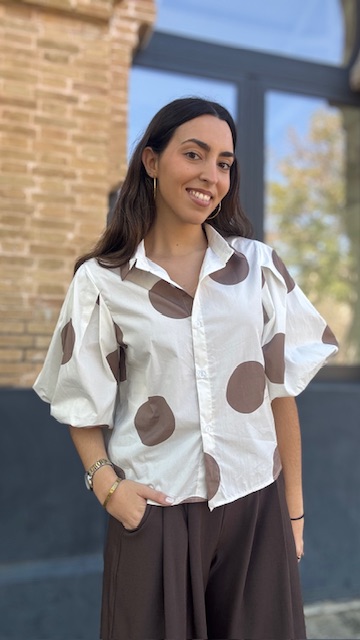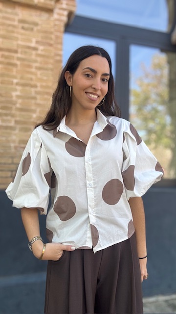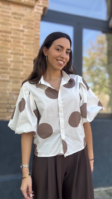 Camisa con mangas abullonadas en color beige con lunares en color marrón con botonadura en la parte delantera. Talla única válida desde la talla 36 hasta la talla 42/44.